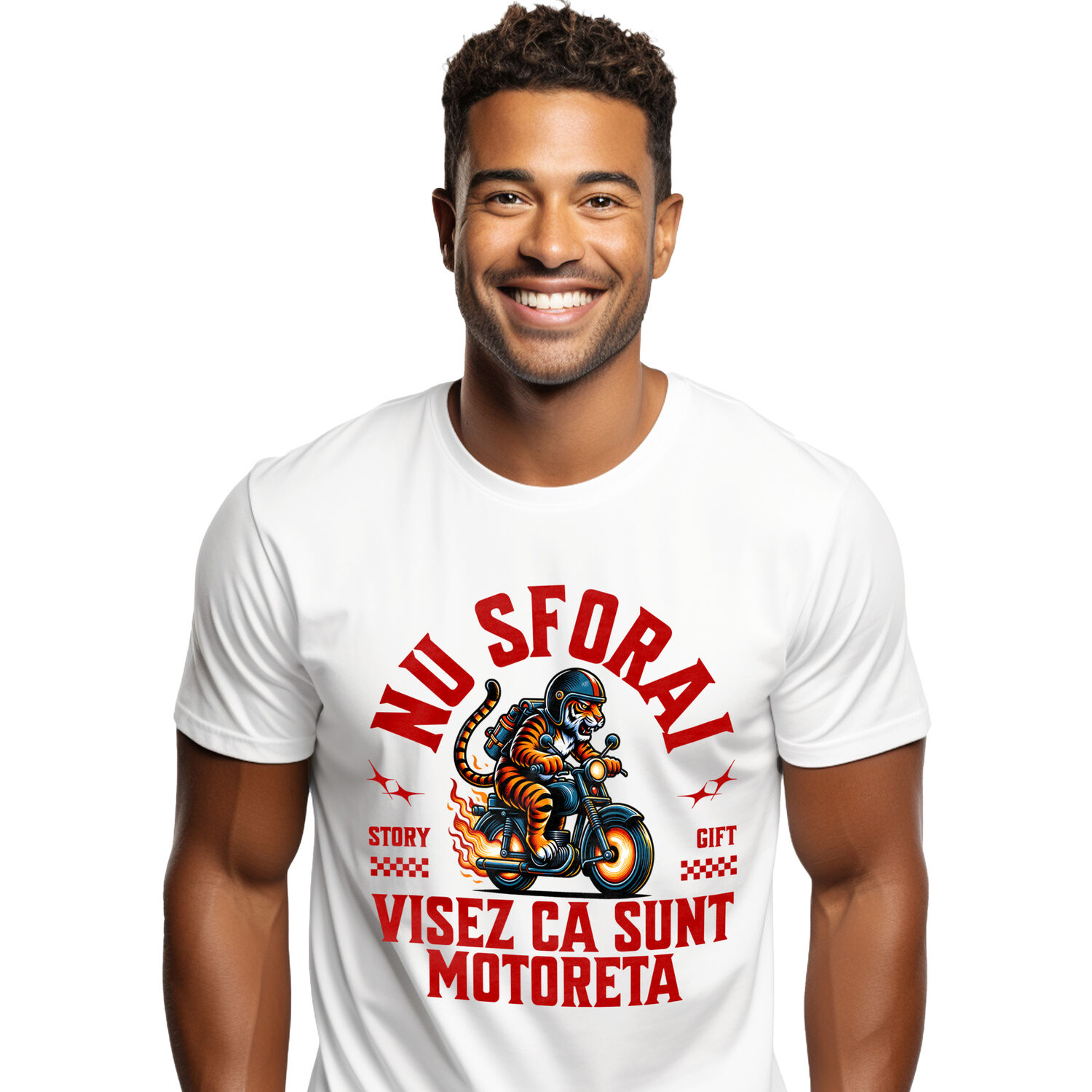 Tricou Barbati cu Tigru Furios Cu Casca Protectie Furios Motor Vintige Desene Animate Pasiune Haios cu imprimeu pe Fata, 100% Bumbac, Alb, M