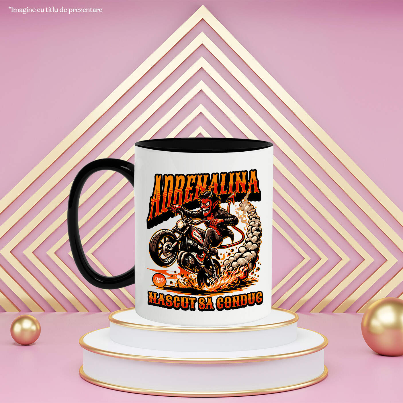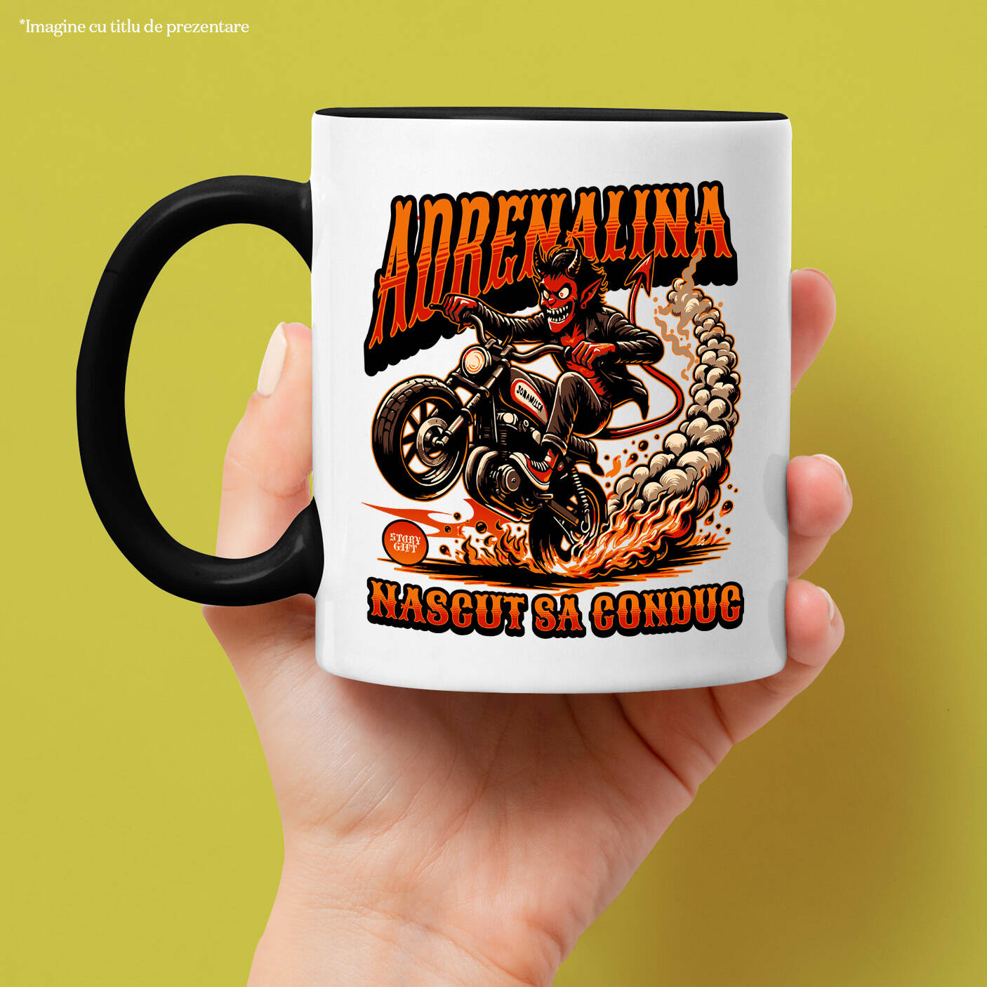 Cana Personalizata cu Diavol Cu Coarne Si Coada Pe Motocicleta Viteza Cursa Adrenalina, Ceramica, 330ML, cu Maner Negru