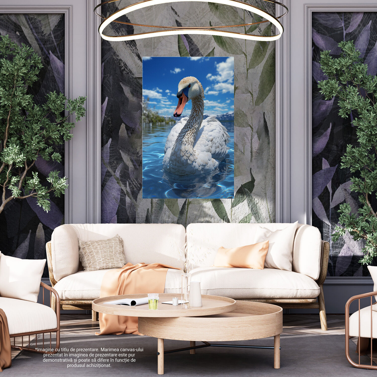 Tablou Canvas: Portret de Zi Lebada pe Apa Albastra cu Pomi si Munti in Fundal Pictura Digitala - Tablou Canvas Signature de la StoryGift Romania