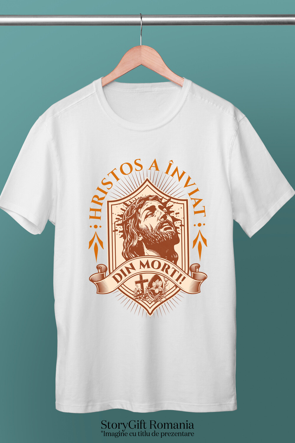 Tricou Barbati cu Chip Iisus Hristos Cu Barba Si Par Lung , Paste Sarbatori Pascale cu imprimeu pe Fata, 100% Bumbac, Alb, M
