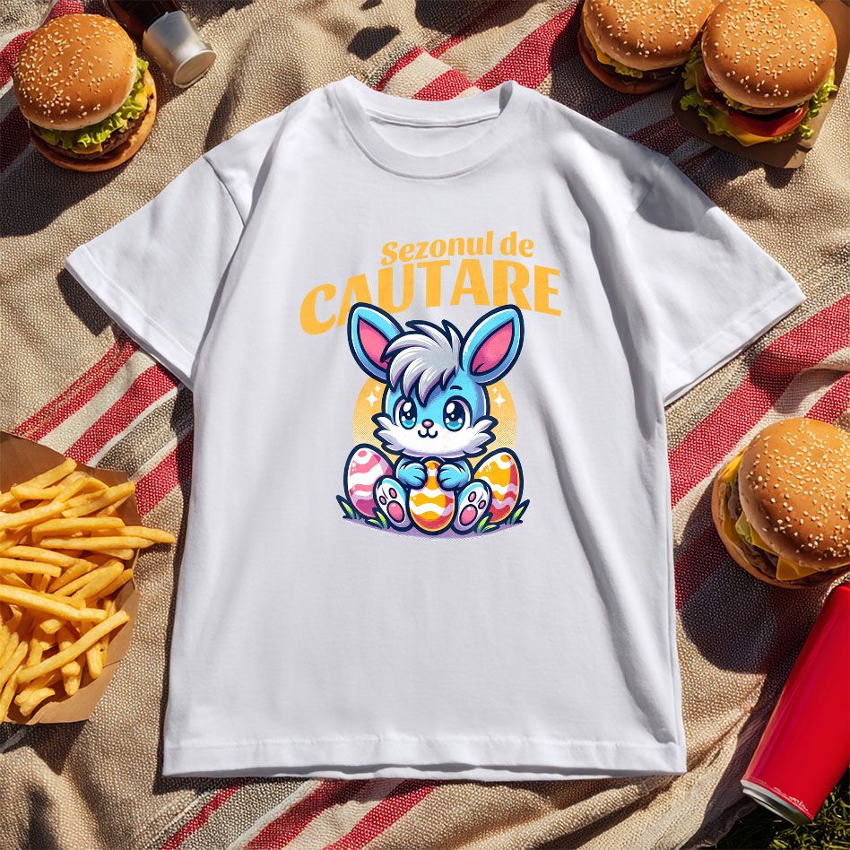 Tricou Copii cu Iepure Albastru Cu Freza Si Oua Colorate De Paste, Distractie, Copii cu imprimeu pe Fata, 100% Bumbac, Alb, 12 Ani