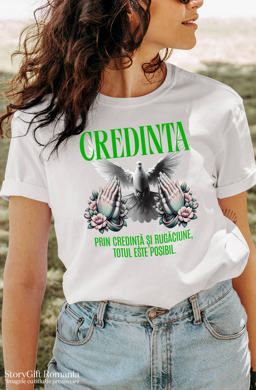 Tricou Femei cu Porumbel Alb Puritate Maine Rugandu-se Credinta Si Rugaciune Religie Sarbatori pascale cu imprimeu pe Fata, 100% Bumbac, Alb, L