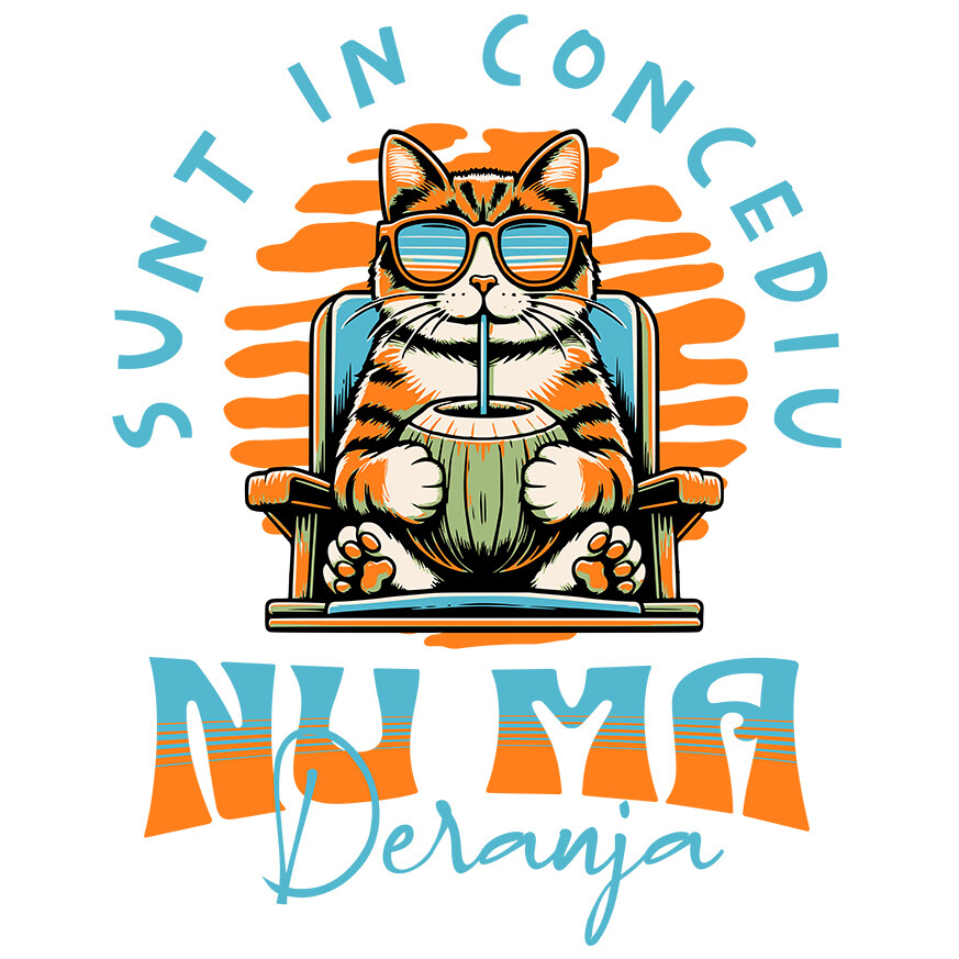 Sticker Personalizat cu Pisica Portocalie Cu Ochelari De Soare Pe Sezlong Cu Nuca De Cocos cu Margini Albe, PVC Vinyl 10 cm