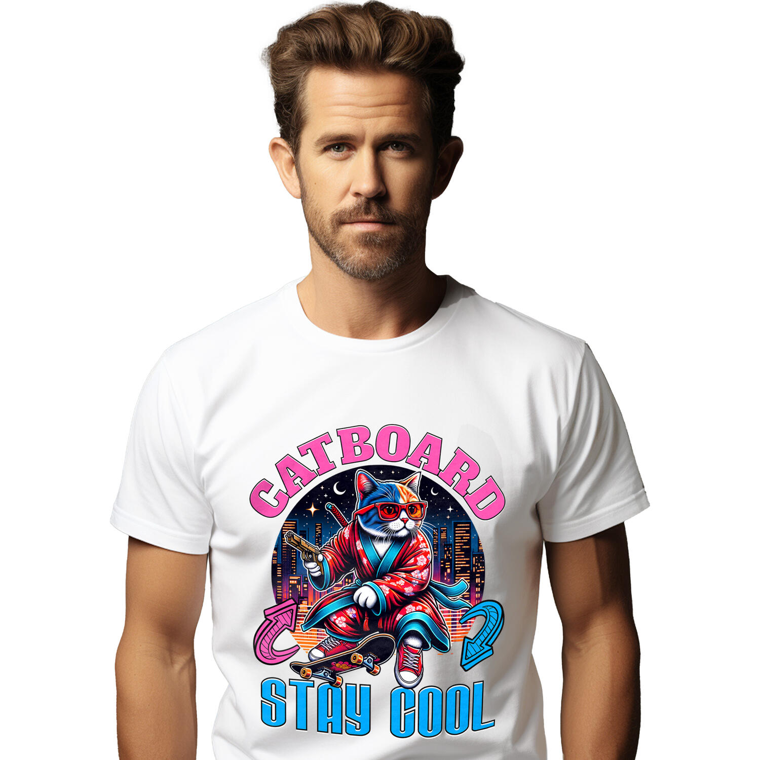 Tricou Barbati cu Pisica Cu Tinuta asiatica Skateboard Noaptea Strazi oras Luminat cu imprimeu pe Fata, 100% Bumbac, Alb, L