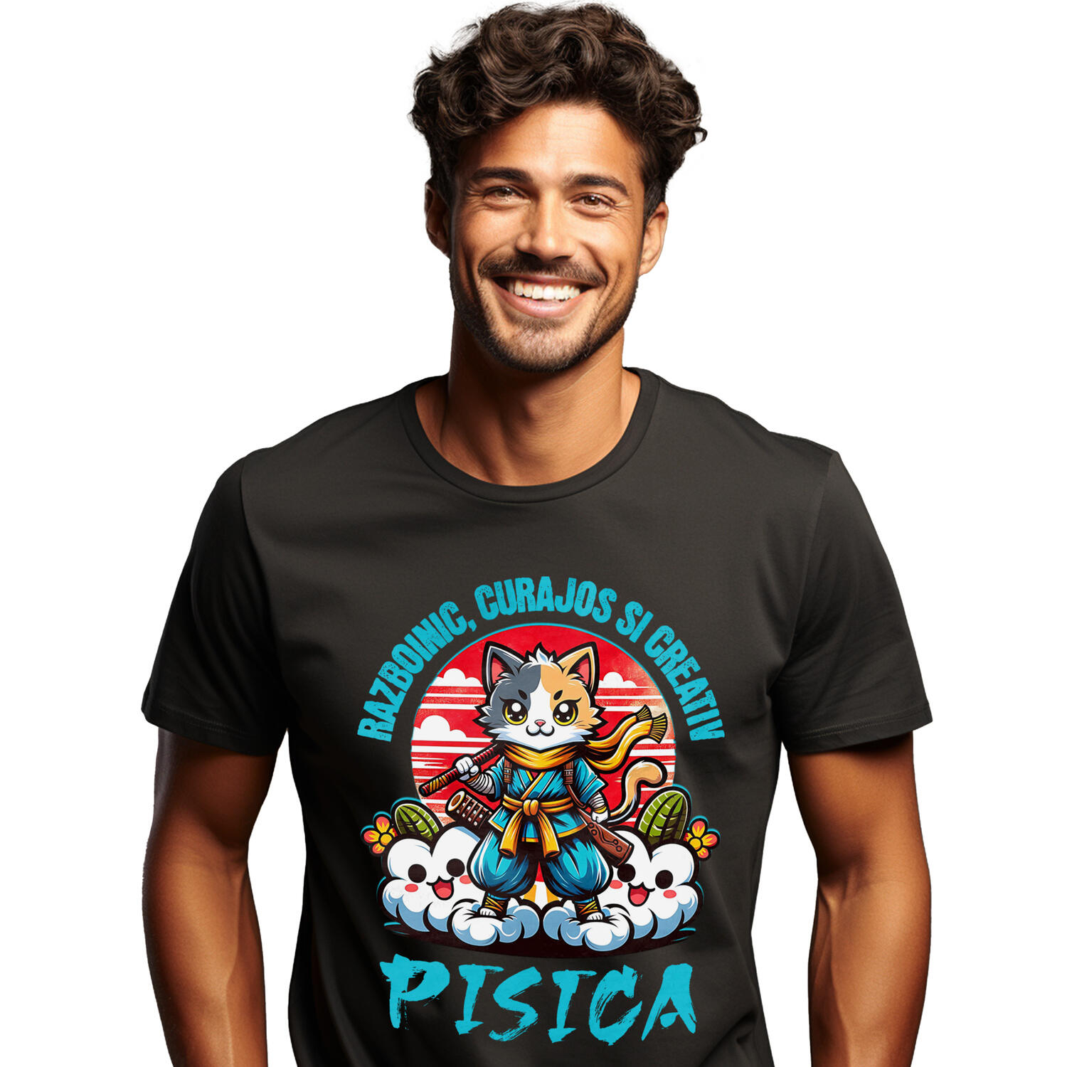 Tricou Barbati cu Pisica Cu Tinuta Si Sabii De Ninja Motan Iubitorii De Animale cu imprimeu pe Fata, 100% Bumbac, Negru, L