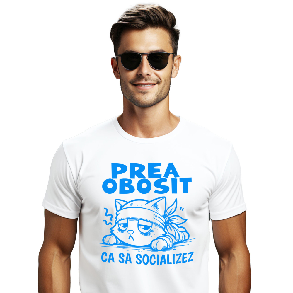 Tricou Barbati cu Pisica extenuata Trista Animal Blanos, Iubitorii De Motani cu imprimeu pe Fata, 100% Bumbac, Alb, L