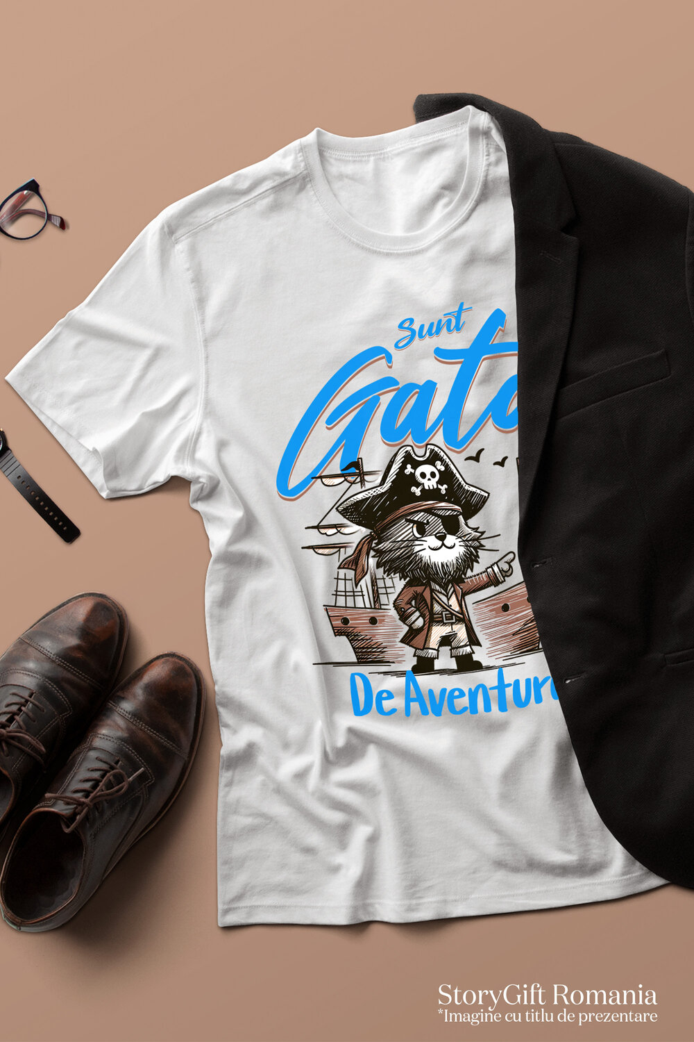 Tricou Barbati cu Pisica Pirat Cu Palarie Si Corabie De Lemn, Copii, Desene Animate, cu imprimeu pe Fata, 100% Bumbac, Alb, L