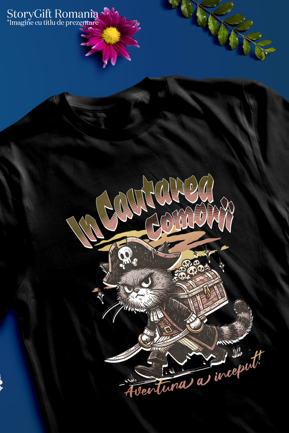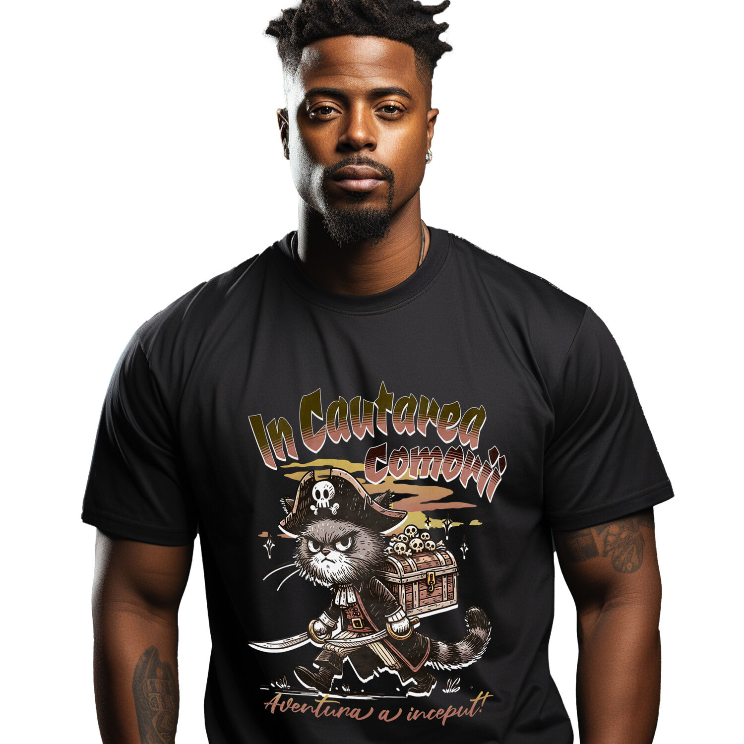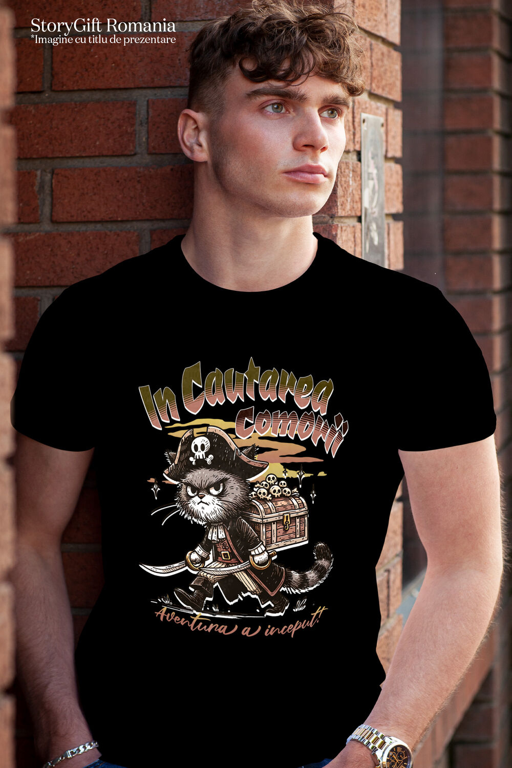 Tricou Barbati cu Pisica Pirat Cu Palarie Si Cufar Cranii, Copii, Desene Animate cu imprimeu pe Fata, 100% Bumbac, Negru, L