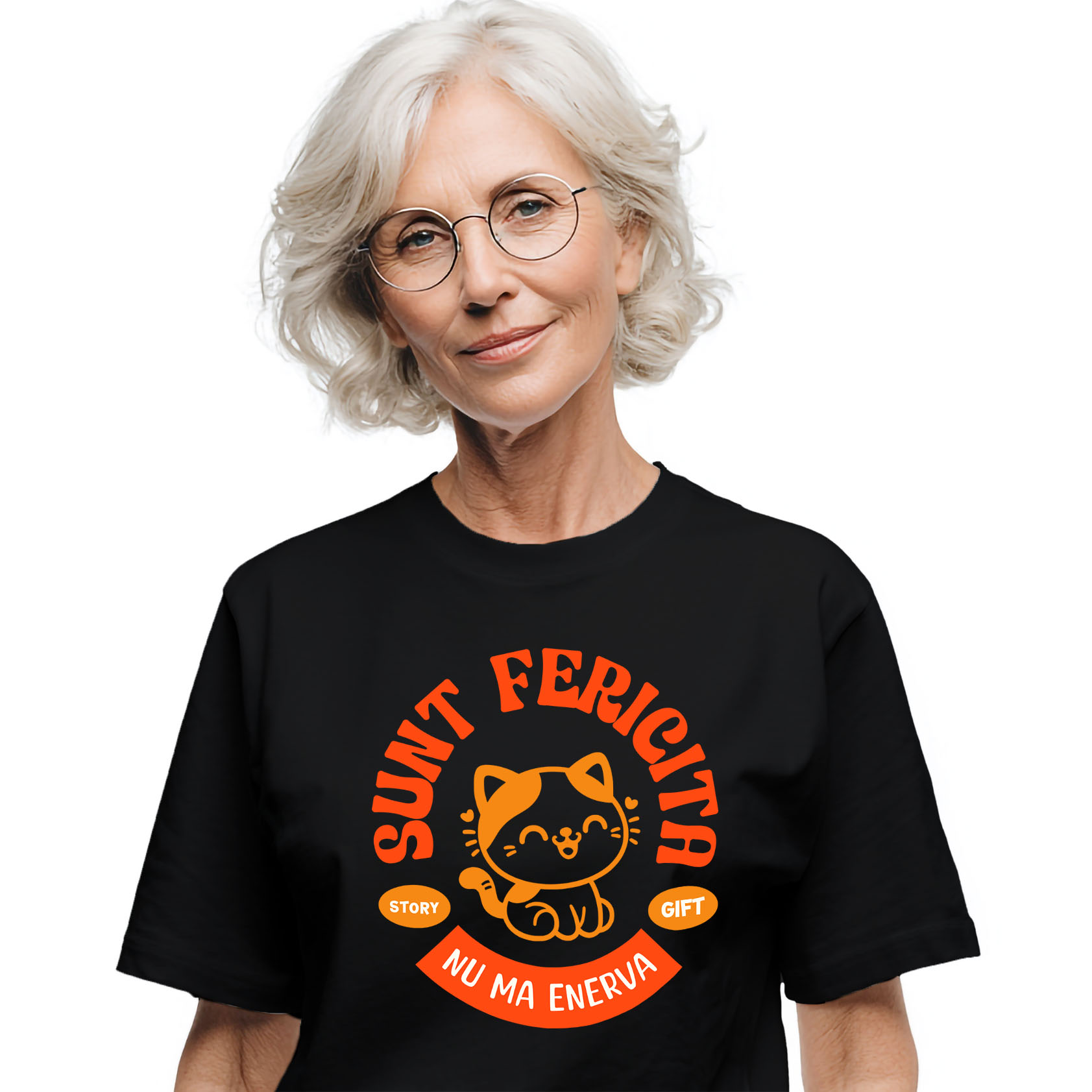 Tricou Femei cu Pisica Vesela Portocalie Fericita Motani, Iubitorii De Animale cu imprimeu pe Fata, 100% Bumbac, Negru, M