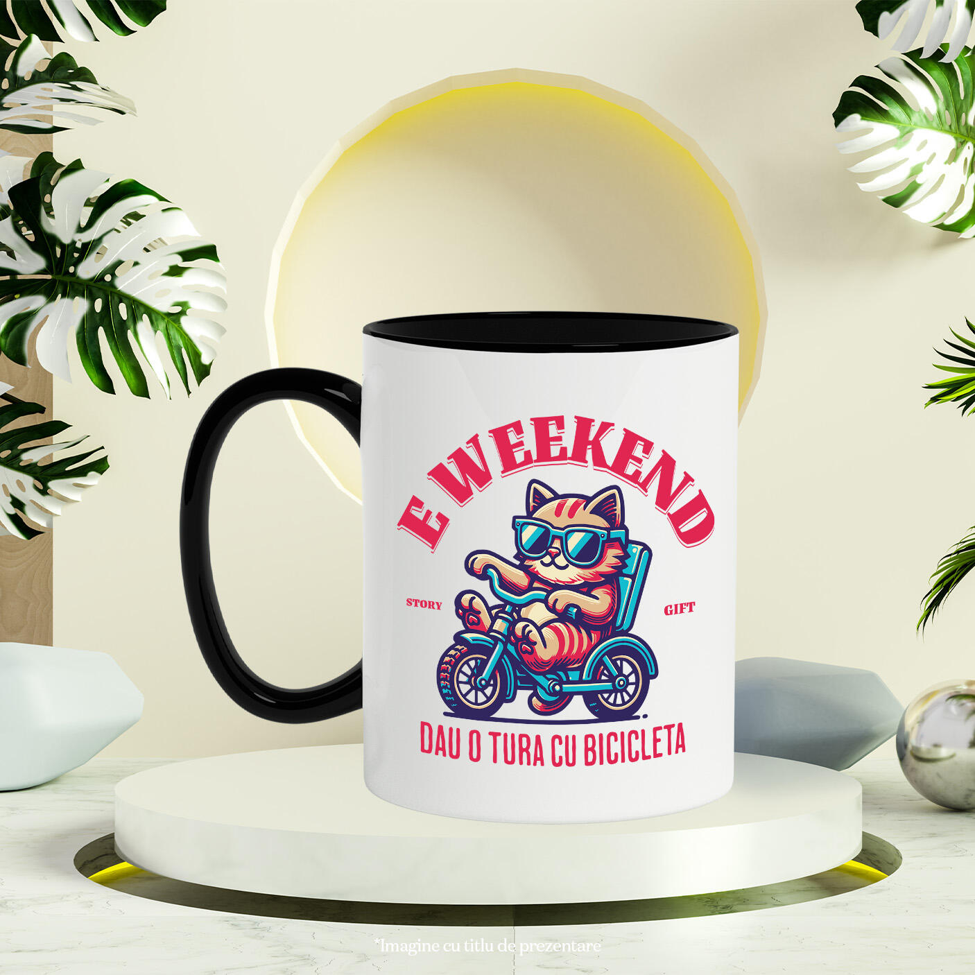 Cana Personalizata cu Motan Cu Ochelari De Soare Pe Tricicleta Weekend Relaxare, Copii, Ceramica, 330ML, cu Maner Negru
