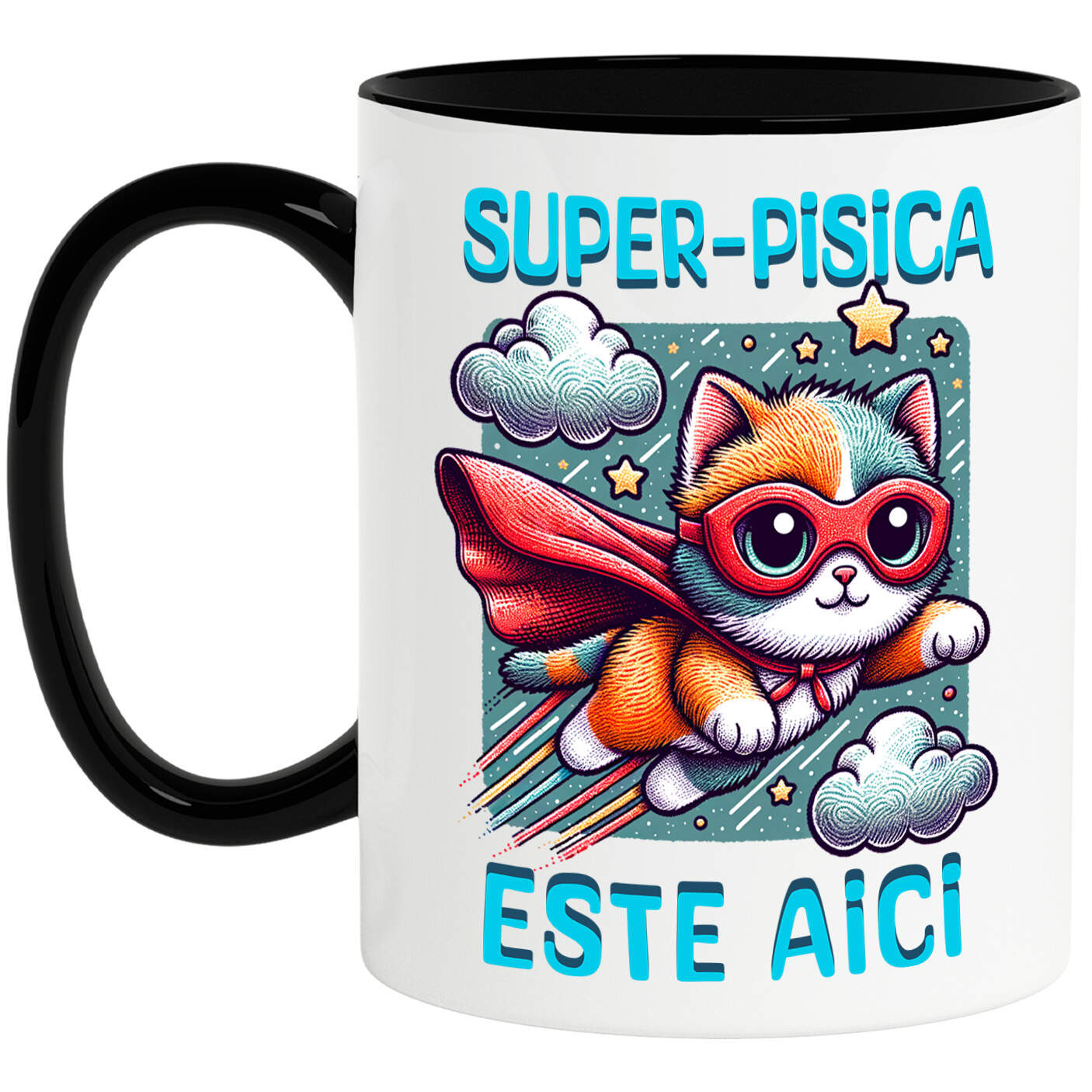 Cana Personalizata cu Pisica In Aer Cu Pelerina si Masca De Super-Erou, Desene Animate, , Ceramica, 330ML, cu Maner Negru