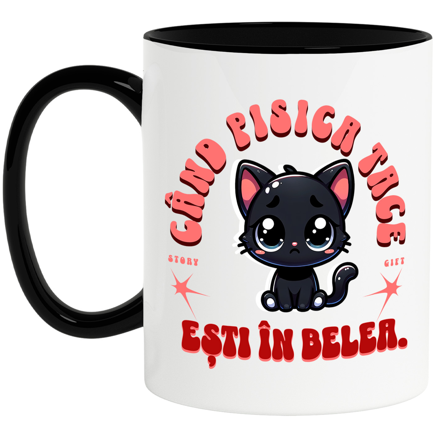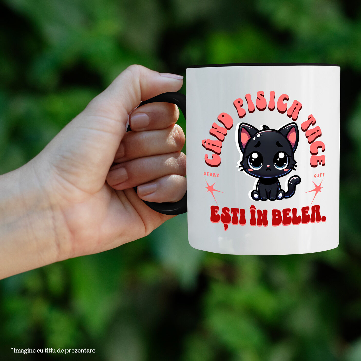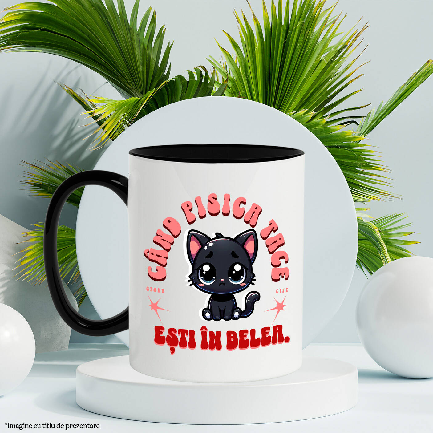 Cana Personalizata cu Pisica Neagra Trista Iubitorii De Motani, Animal Blanos, Copii, Ceramica, 330ML, cu Maner Negru
