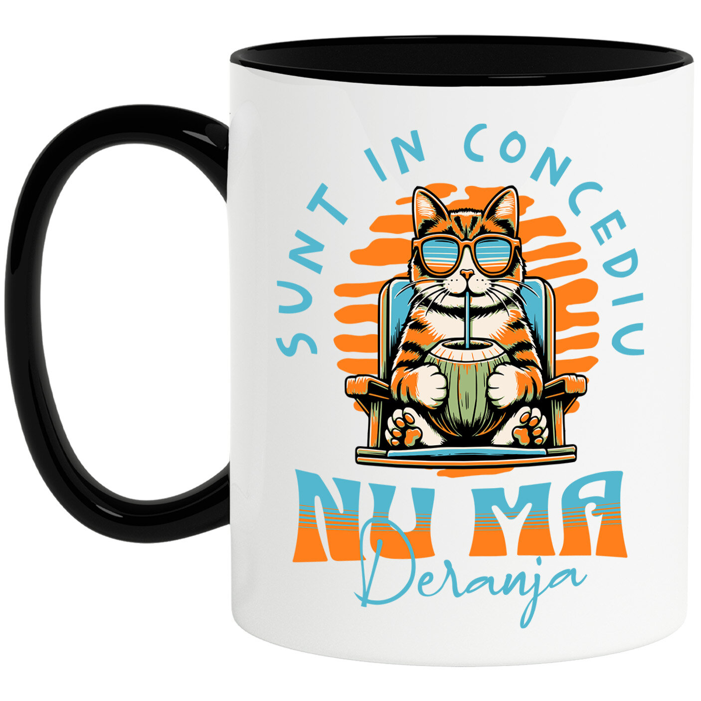 Cana Personalizata cu Pisica Portocalie Cu Ochelari De Soare Pe Sezlong Cu Nuca De Cocos, Ceramica, 330ML, cu Maner Negru