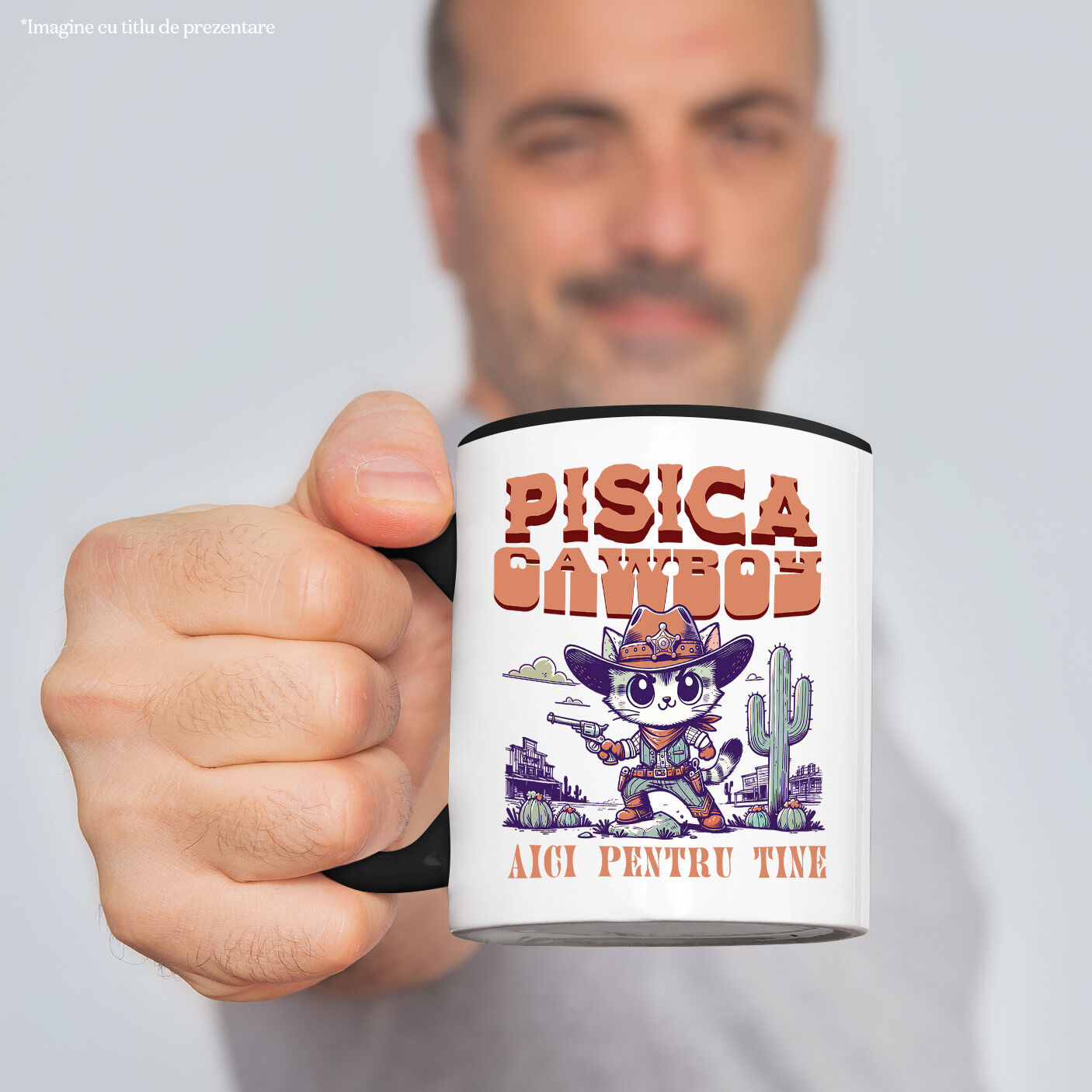 Cana Personalizata cu Pisica Stil Cowboy Vestul Salbatic, Iubitorii De Motani Si Pisici, Ceramica, 330ML, cu Maner Negru