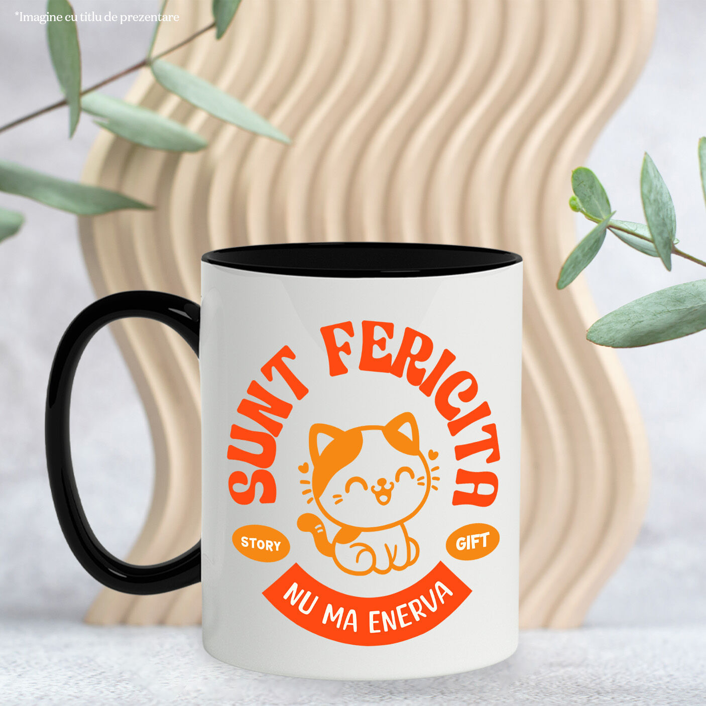 Cana Personalizata cu Pisica Vesela Portocalie Fericita Motani, Iubitorii De Animale, Ceramica, 330ML, cu Maner Negru