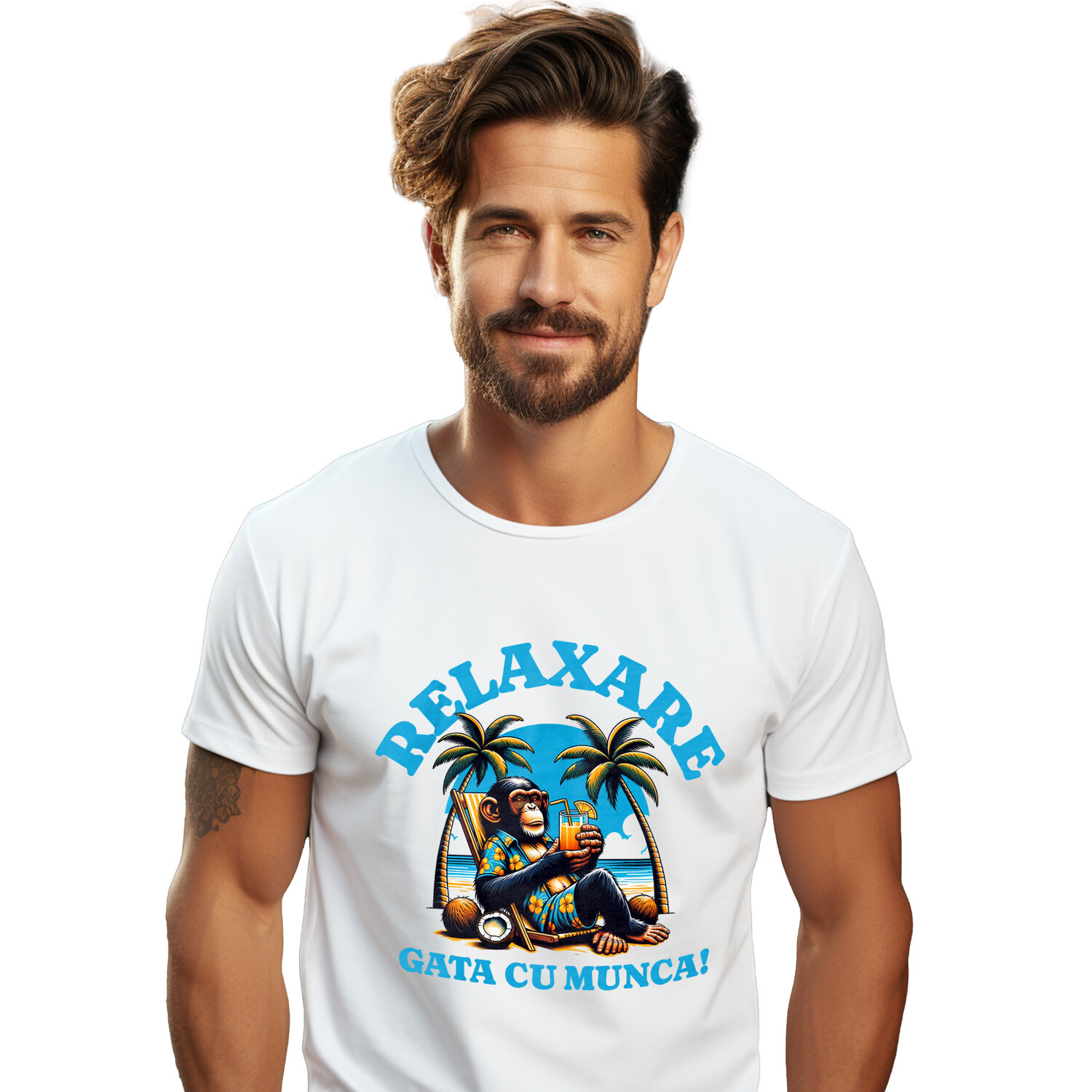 Tricou Barbati cu Maimuta In Costum De Plaja Cu Flori Pe Sezlong Plaja Tropicala bautura Racoritoare cu imprimeu pe Fata, 100% Bumbac, Alb, M
