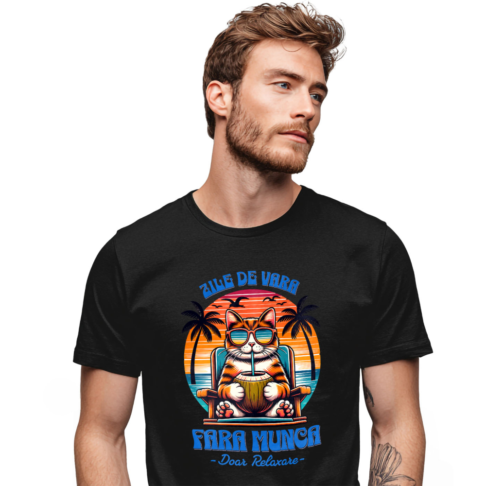 Tricou Barbati cu Pisica Portocalie Cu ochelarii De Soare Pe Sezlong Cu Nuca De Cocos, Plaja Tropicala cu imprimeu pe Fata, 100% Bumbac, Negru, L