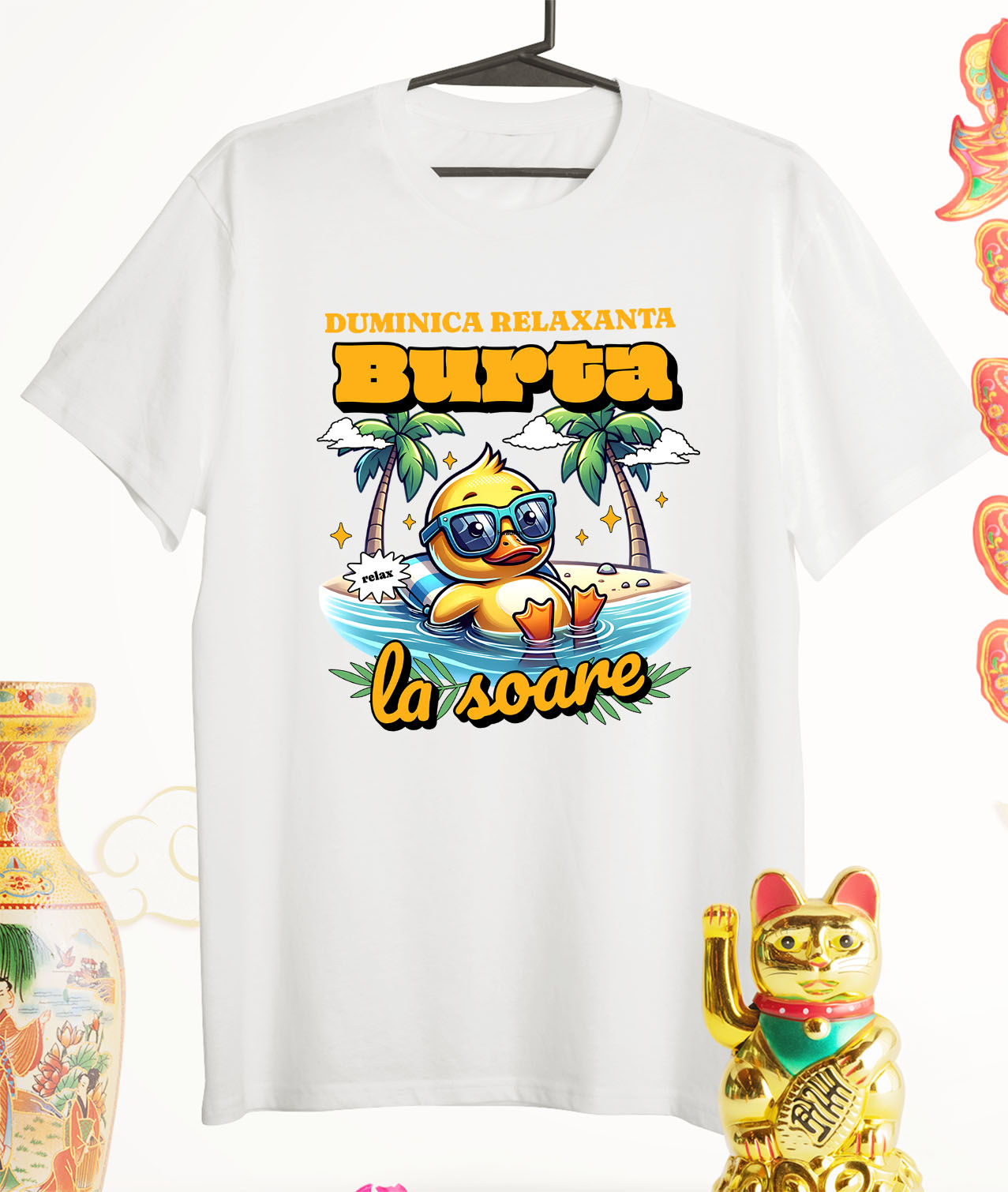 Tricou Barbati cu Ratusca Galbena cu Ochelarii De Soare La Plaja In apa, Vacanta cu imprimeu pe Fata, 100% Bumbac, Alb, S