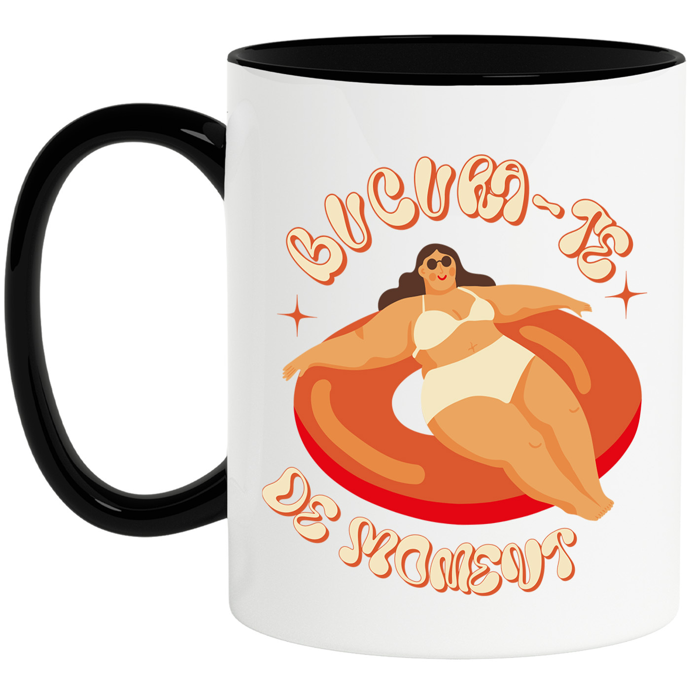 Cana Personalizata cu Femeie Cu Ochelari De Soare Pe Colac, Relaxare, Vacanta, Ceramica, 330ML, cu Maner Negru