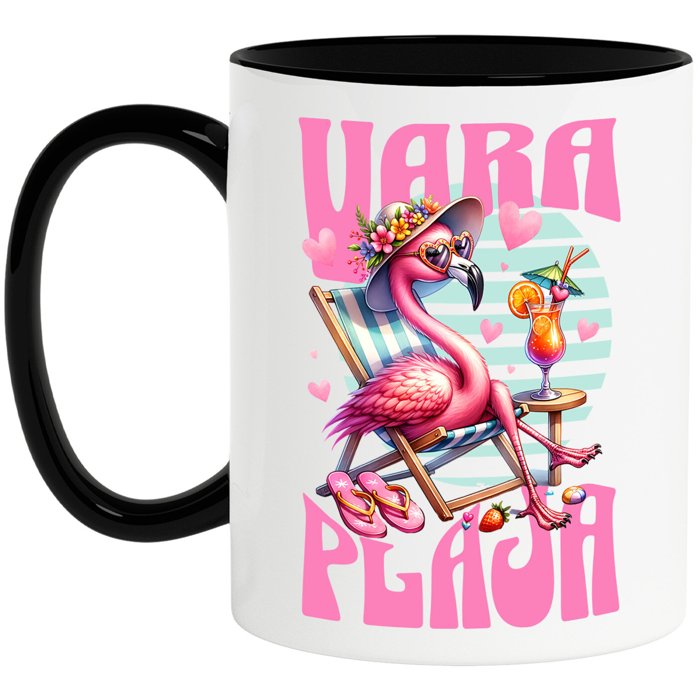 Cana Personalizata cu Pasa Famingo Roz Cu Palarie Florala Cocktail Relaxare , Ceramica, 330ML, cu Maner Negru