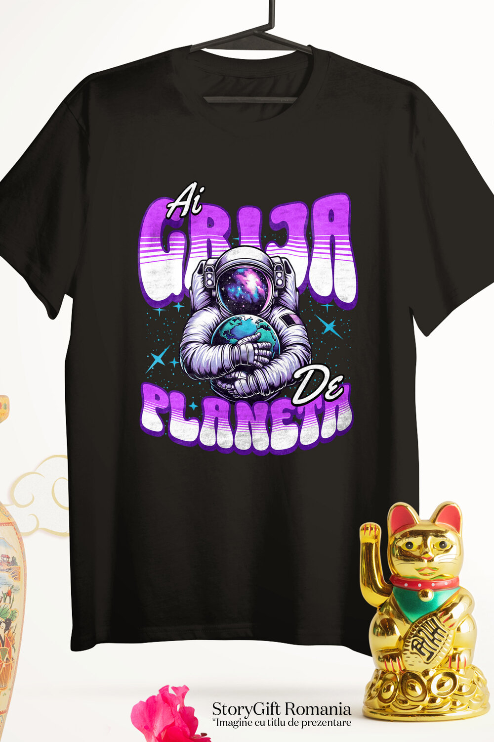 Tricou Barbati cu Astronaut Costum Spatial Imbratisare Planeta Pamant Natura, Poluare cu imprimeu pe Fata, 100% Bumbac, Negru, L