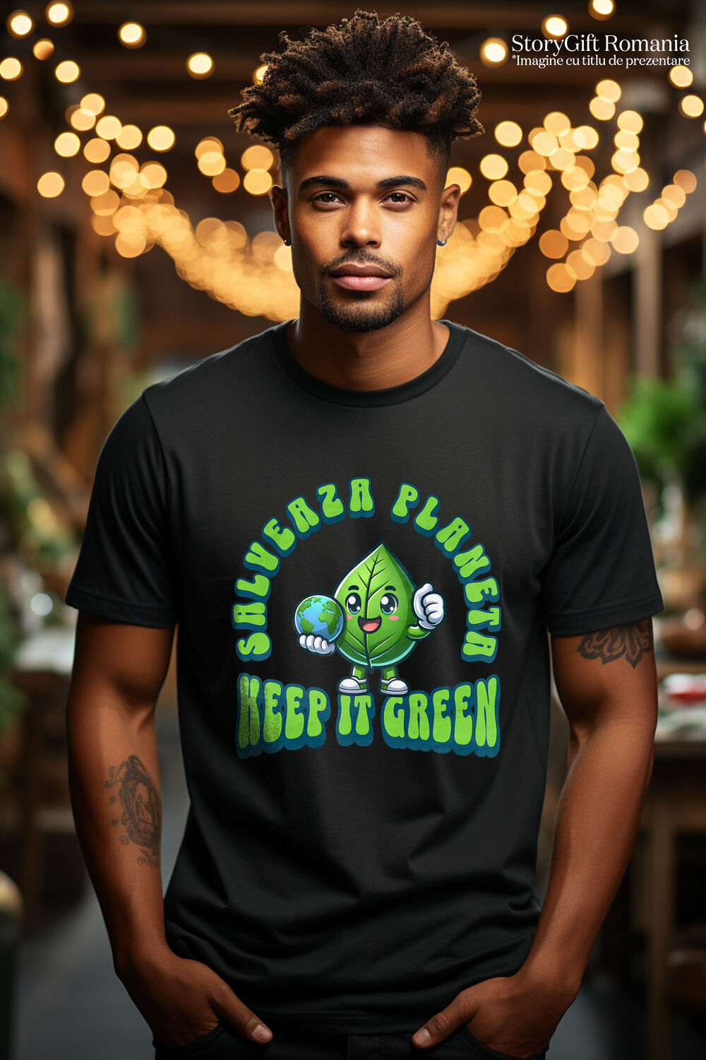 Tricou Barbati cu Frunza Verde Vesela Glob Pamantesc In Mana, Poluare, Urbanizare cu imprimeu pe Fata, 100% Bumbac, Negru, L