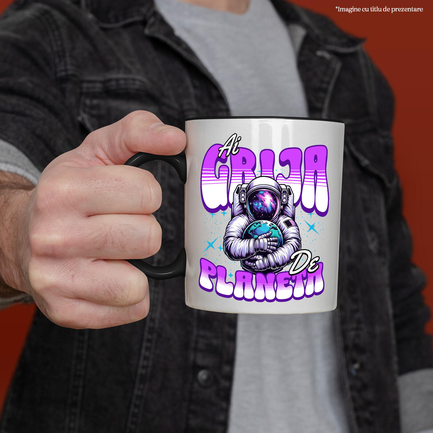 Cana Personalizata cu Astronaut Costum Spatial Imbratisare Planeta Pamant Natura, Poluare, Ceramica, 330ML, cu Maner Negru