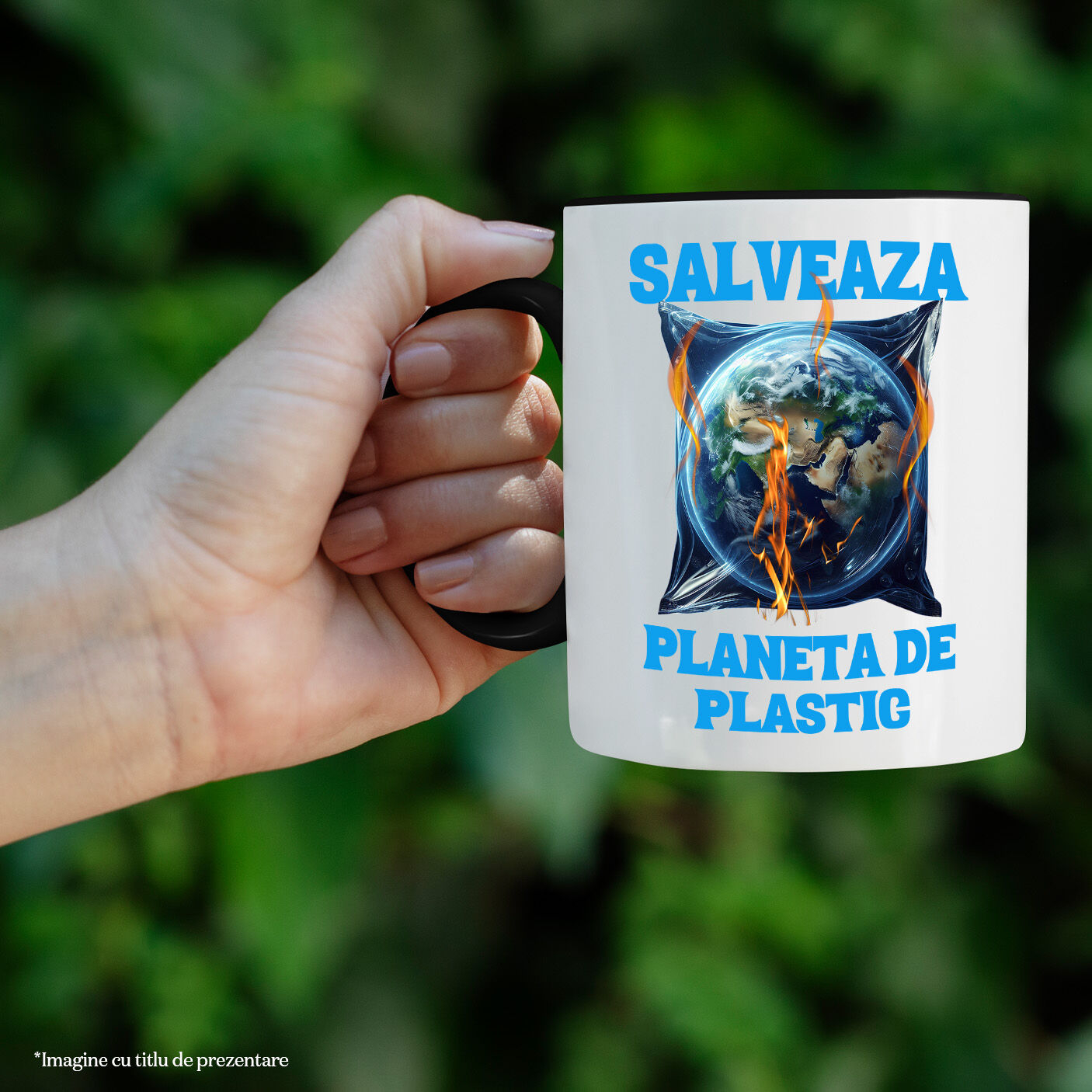 Cana Personalizata cu Pamant Terra In Punga Plastic Flacari, Poluare fara Aer Curat , Ceramica, 330ML, cu Maner Negru