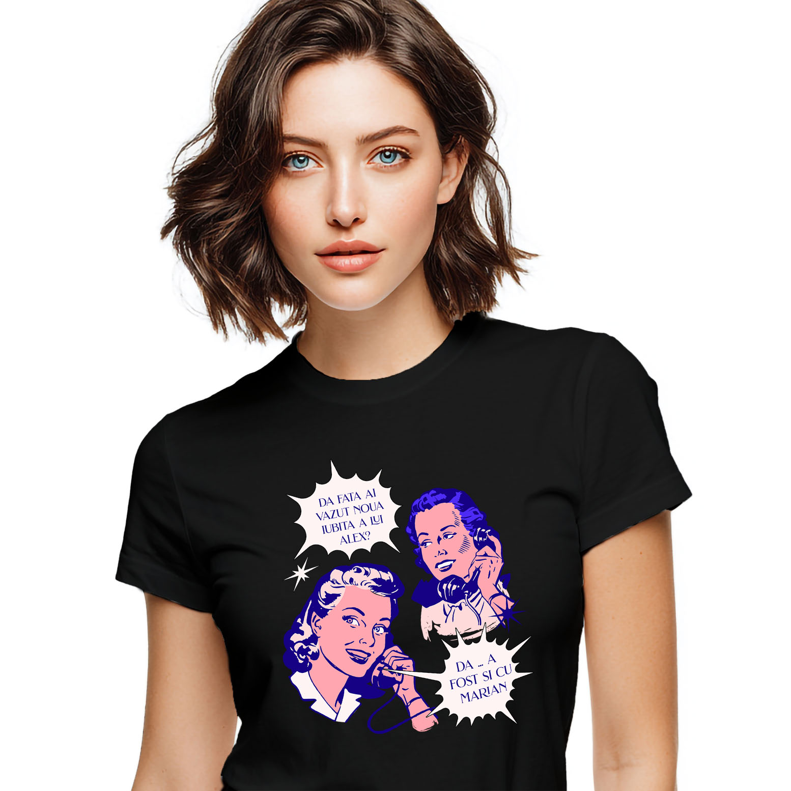 Tricou Femei cu Fete Convorbire Telefonica Barfe, drama, Prietenie, Placere, Distractie cu imprimeu pe Fata, 100% Bumbac, Negru, XL