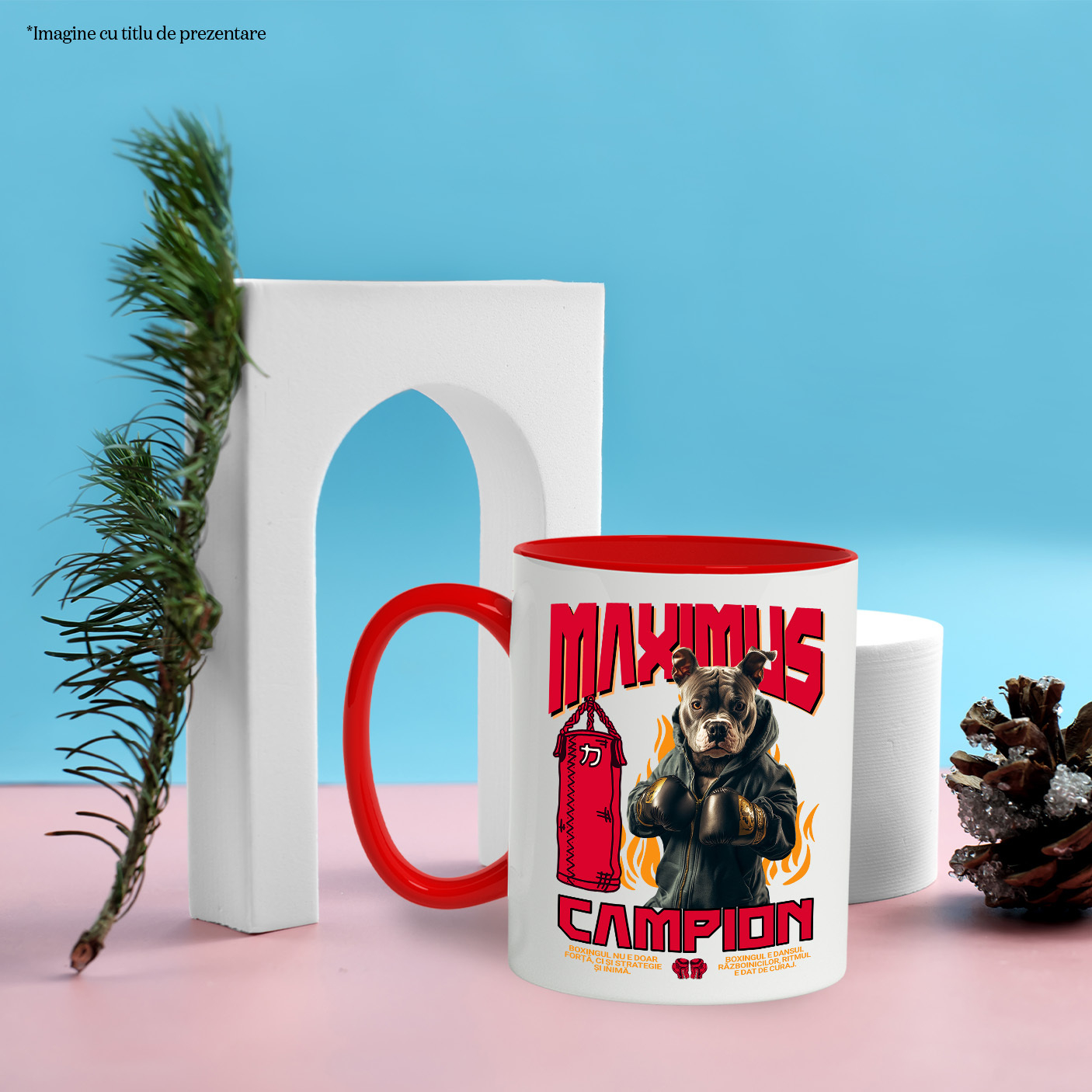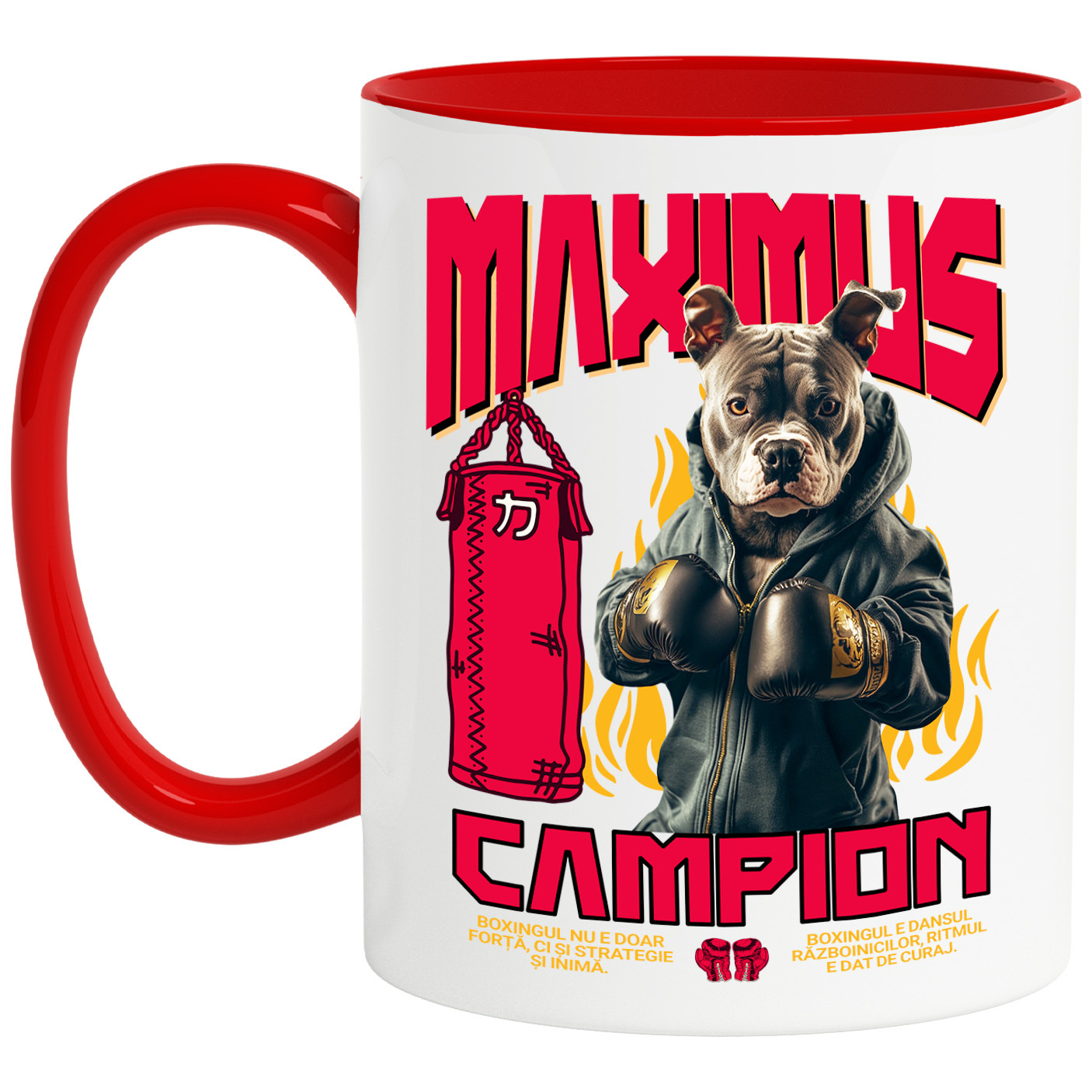 Cana cu Animal Boxer In Hanorac, Sac de Box, Flacari, Peronalizata cu Numele si Poza Animalului Tau cu Maner Rosu