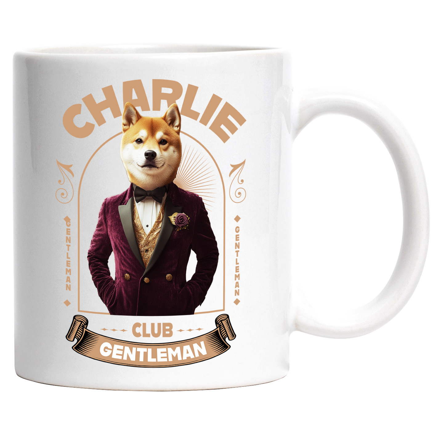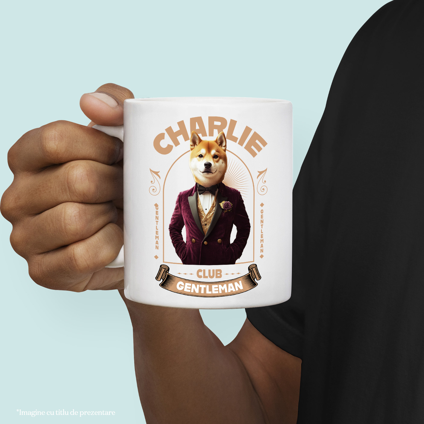 Cana cu Animal Gentleman in Costum, Camasa, Papion si Floare Trandfir, Peronalizata cu Numele si Poza Animalului Tau cu Maner Alb