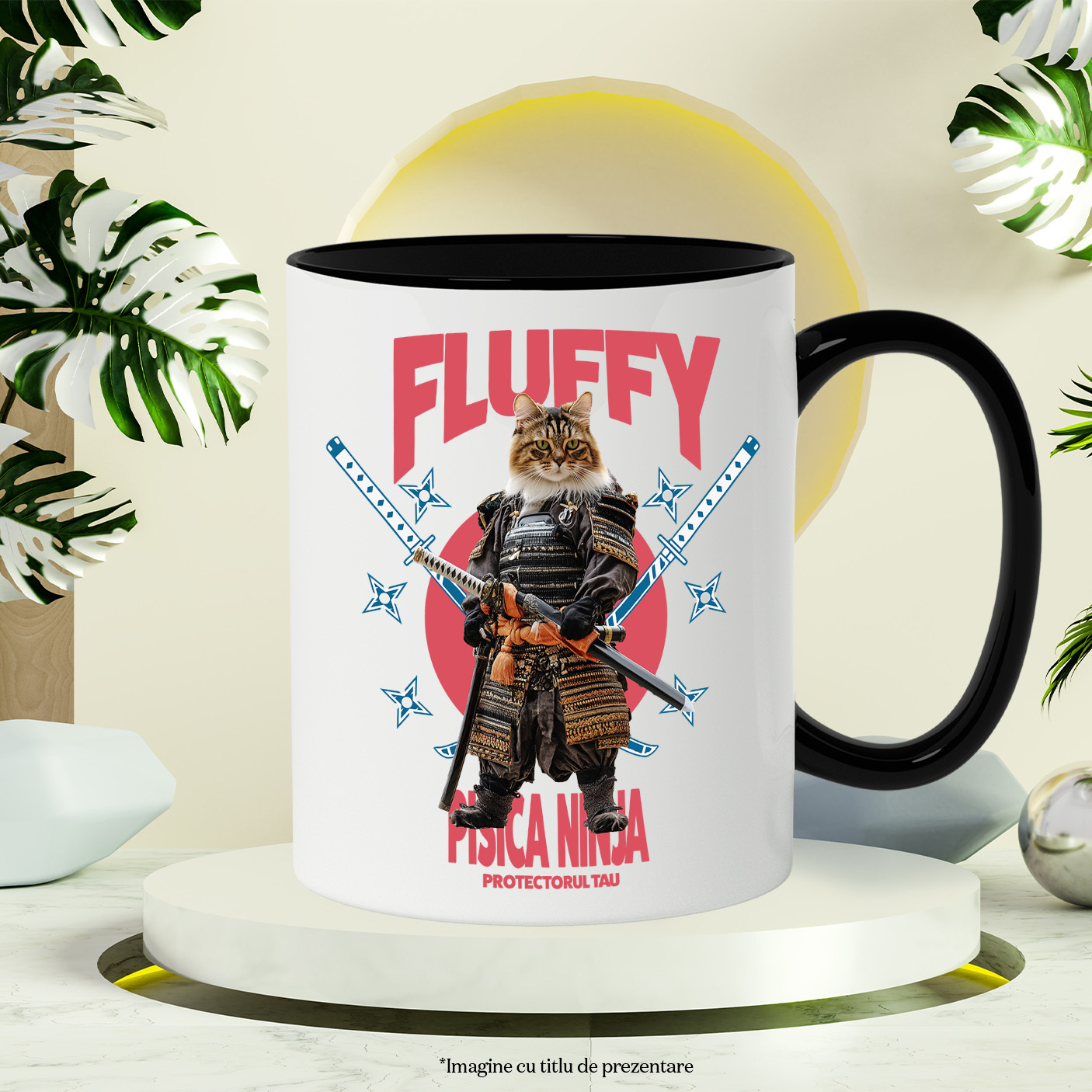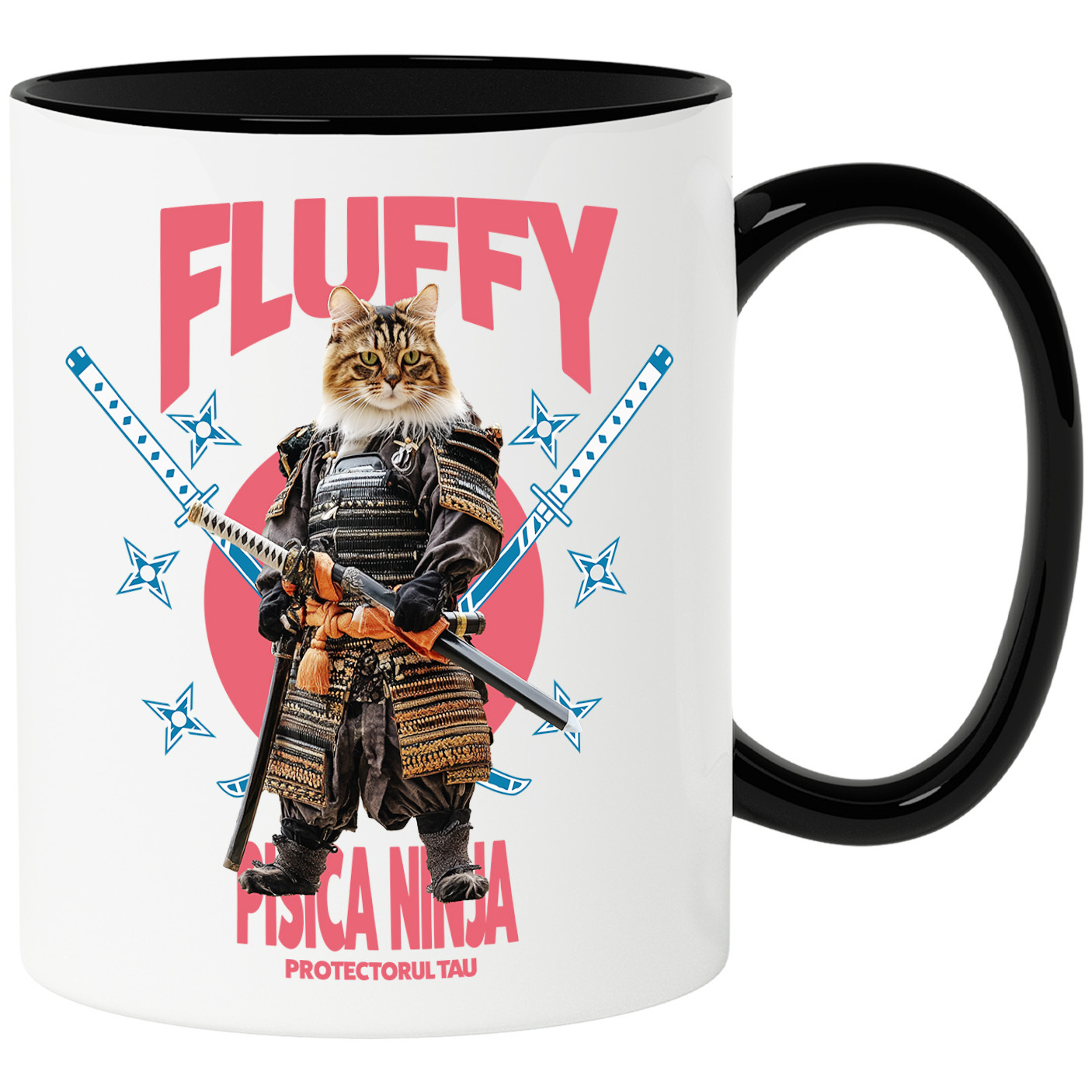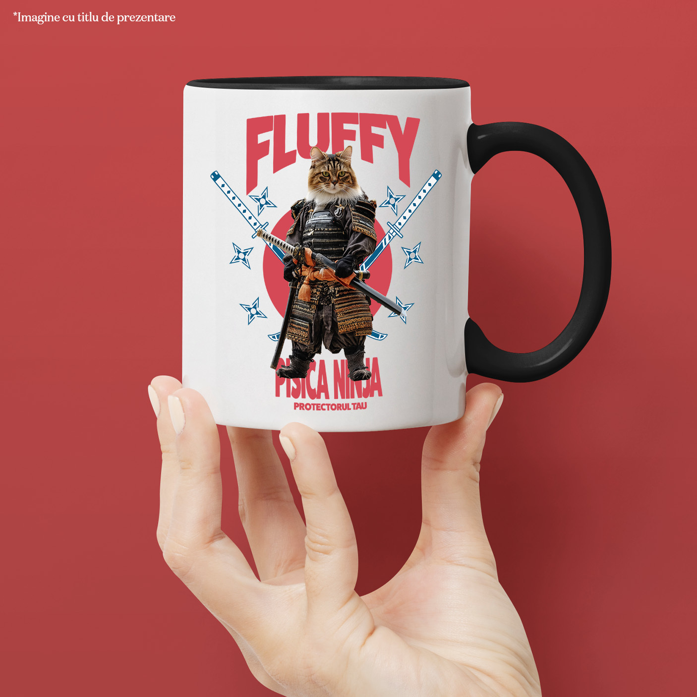 Cana cu Animal In Costum de Samurai cu Sabie, Peronalizata cu Numele si Poza Animalului Tau cu Maner Negru
