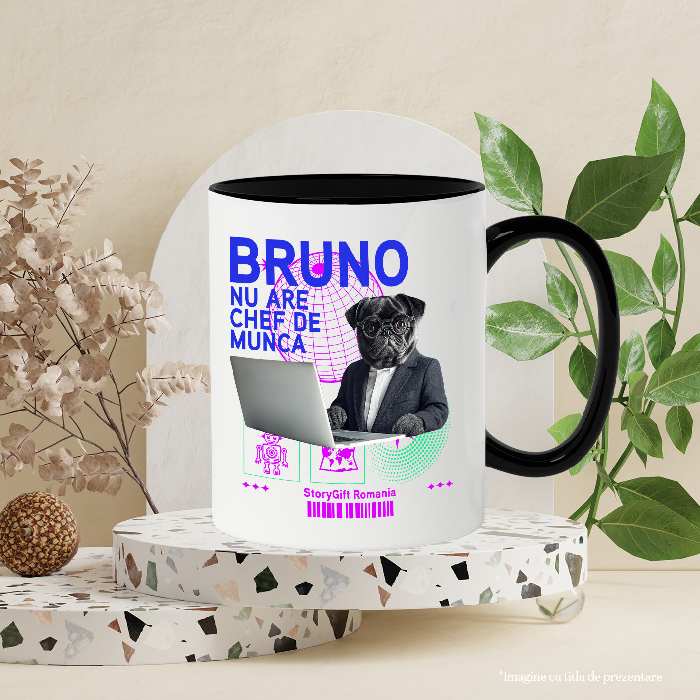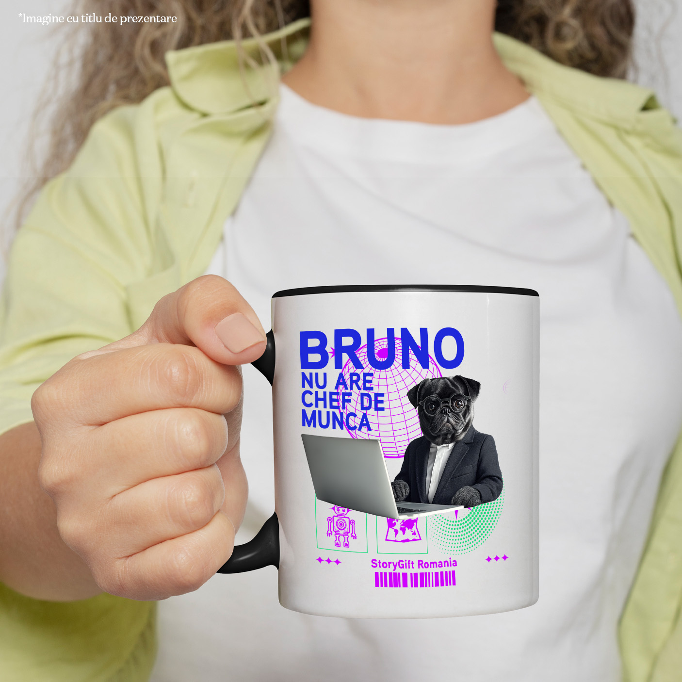 Cana cu Animal In Costum Lucrand pe Laptop, Peronalizata cu Numele si Poza Animalului Tau cu Maner Negru