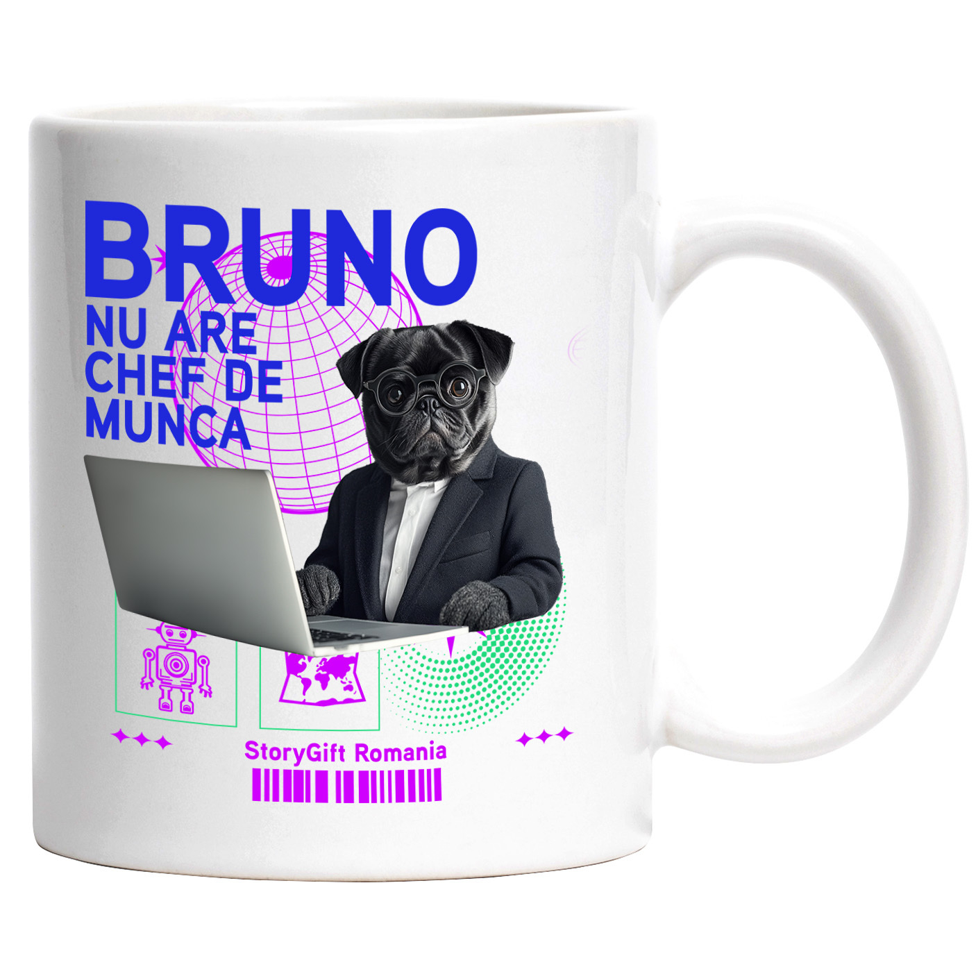 Cana cu Animal In Costum Lucrand pe Laptop, Peronalizata cu Numele si Poza Animalului Tau cu Maner Alb