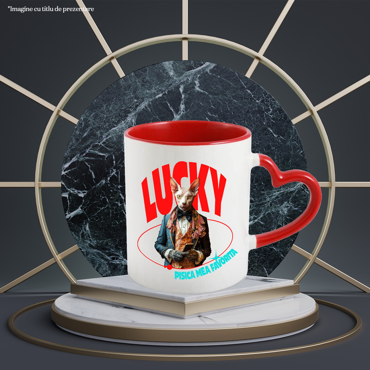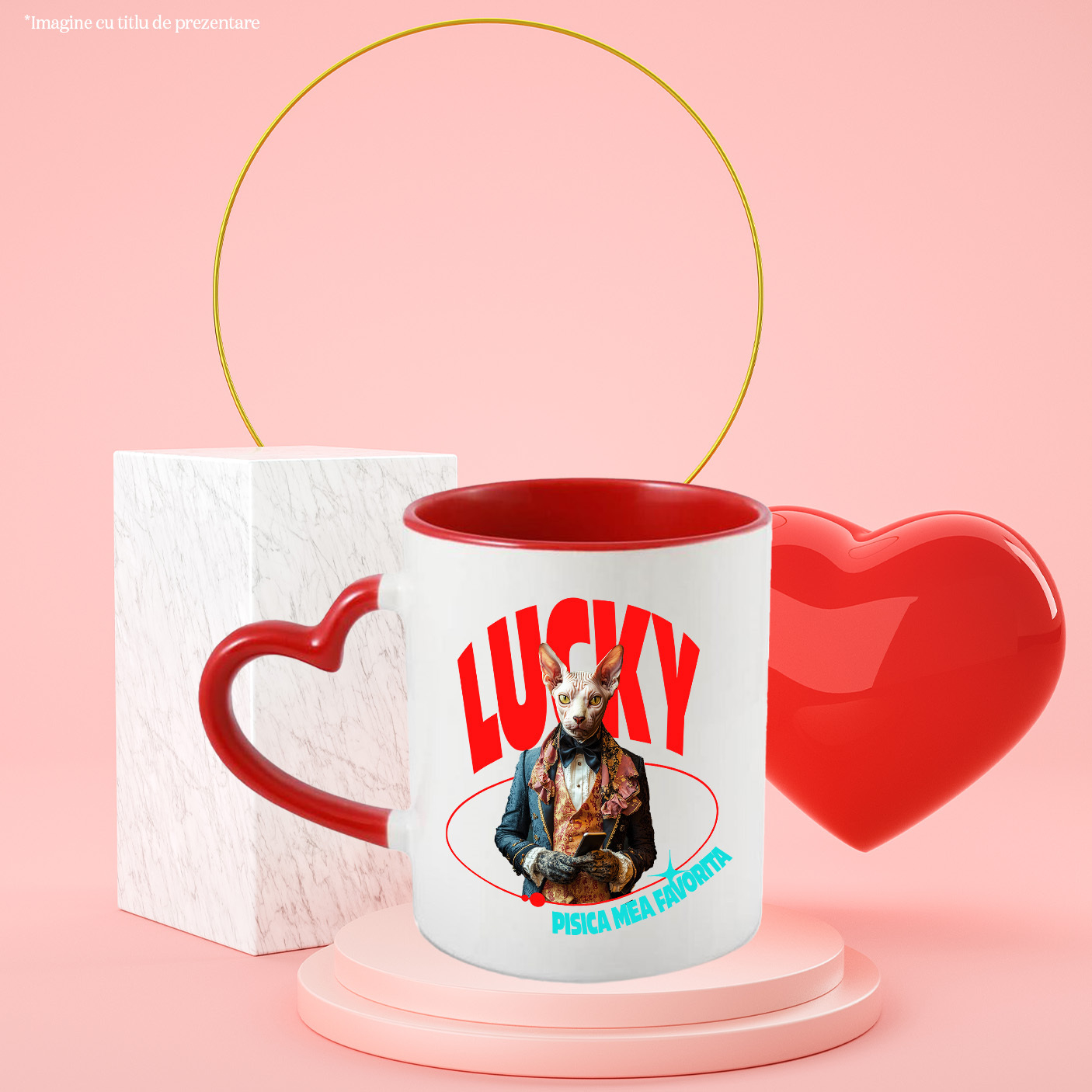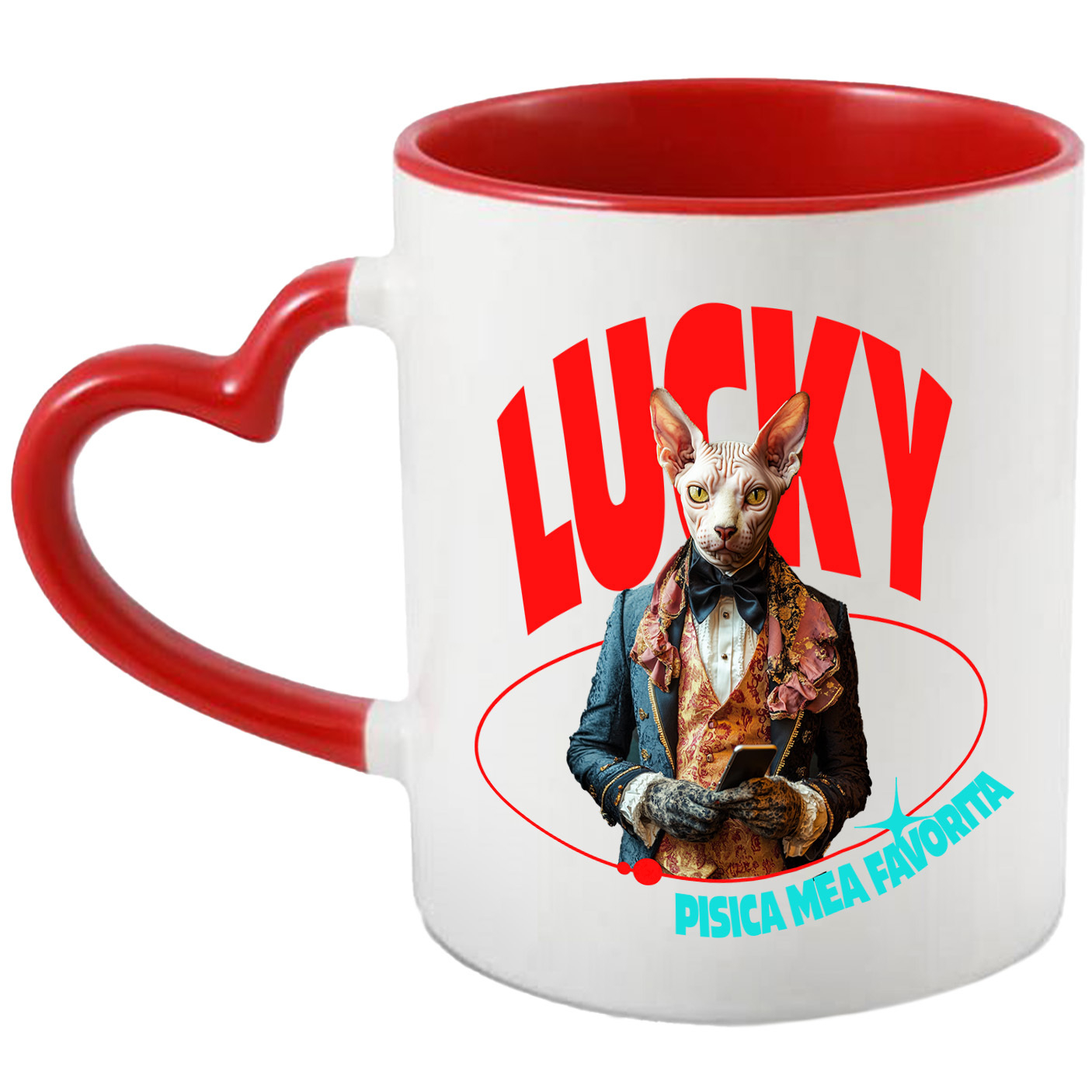 Cana cu Animal in Costum Regal, cu Manusi si Telefonul in Mana, Peronalizata cu Numele si Poza Animalului Tau cu Maner Inima Rosie