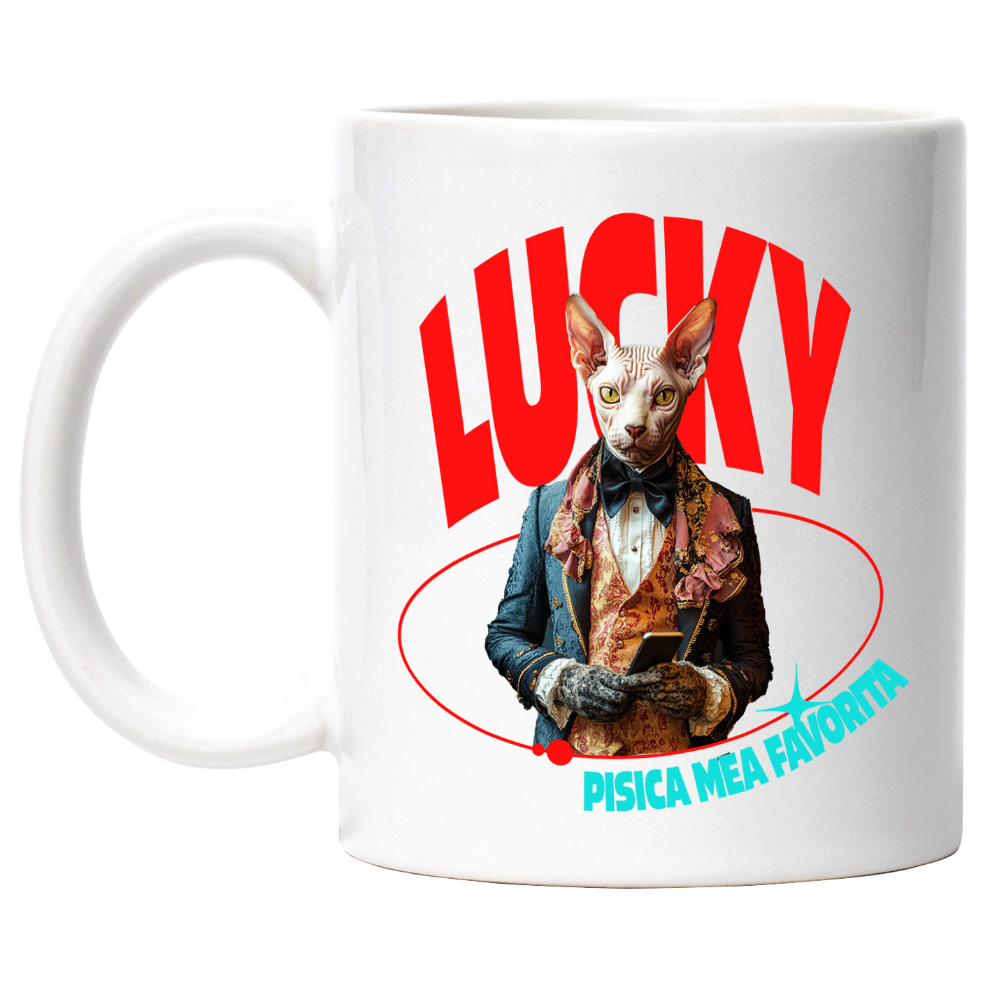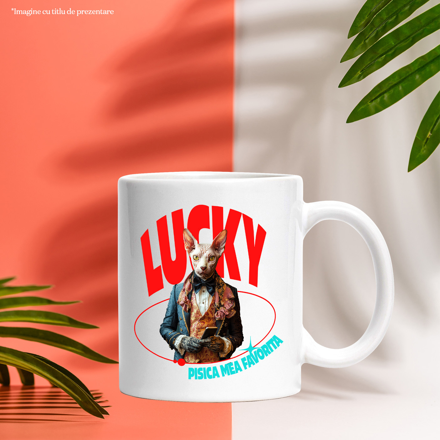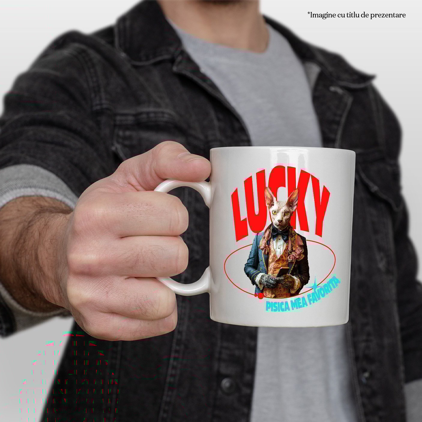 Cana cu Animal in Costum Regal, cu Manusi si Telefonul in Mana, Peronalizata cu Numele si Poza Animalului Tau cu Maner Alb