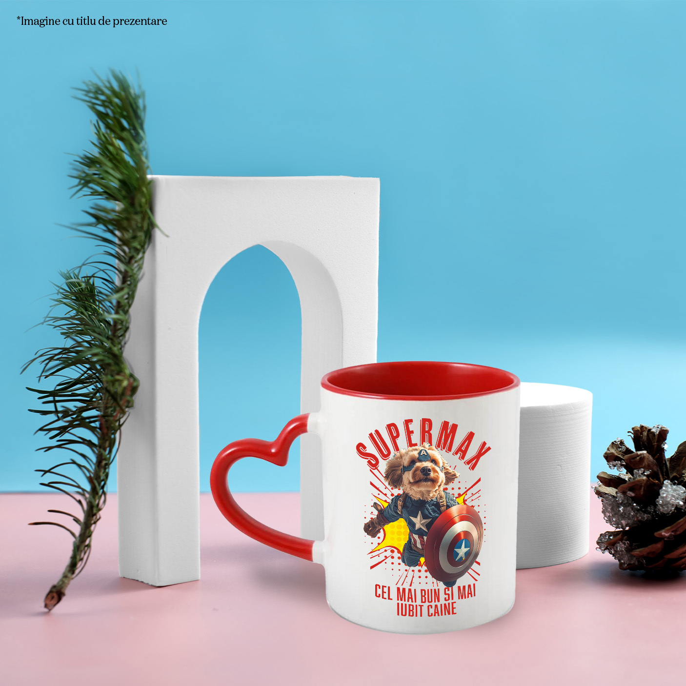 Cana cu Animal In Costumul lui Capitanul America, Zburand, Scut, Peronalizata cu Numele si Poza Animalului Tau cu Maner Inima Rosie