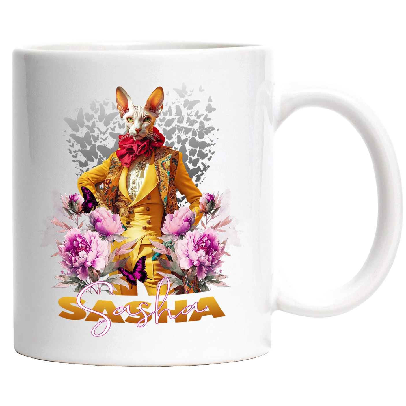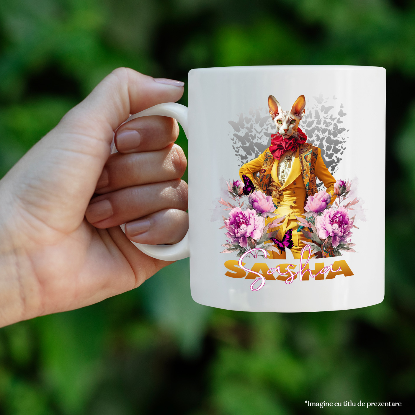 Cana cu Animal La Moda in Costum Galben, Inconjurat de Flori, Peronalizata cu Numele si Poza Animalului Tau cu Maner Alb