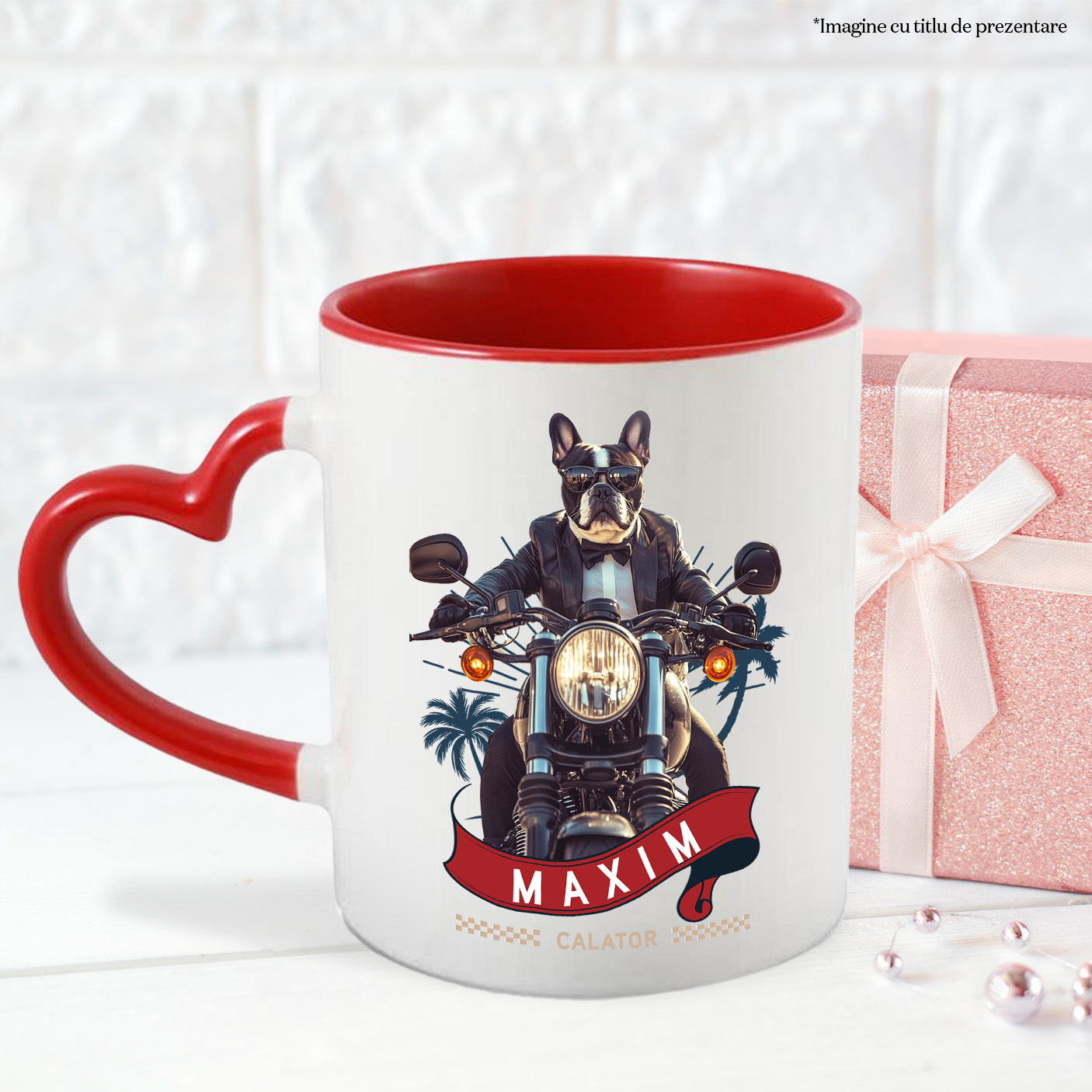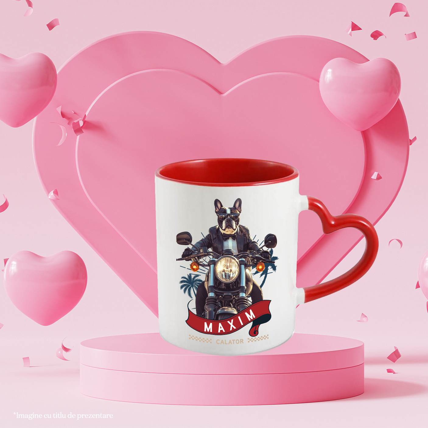 Cana cu Animal Pe Motocicleta in Costum, Peronalizata cu Numele si Poza Animalului Tau cu Maner Inima Rosie