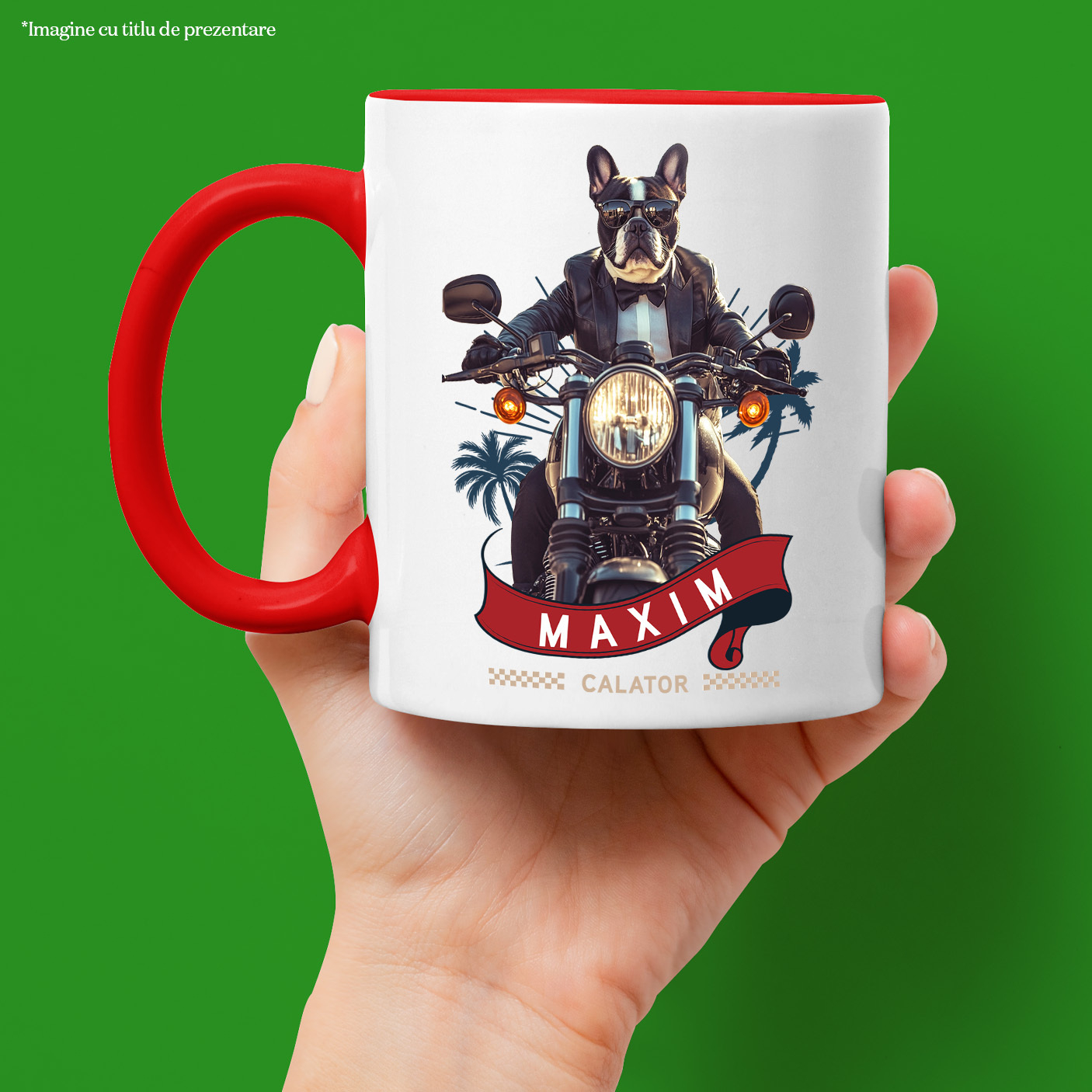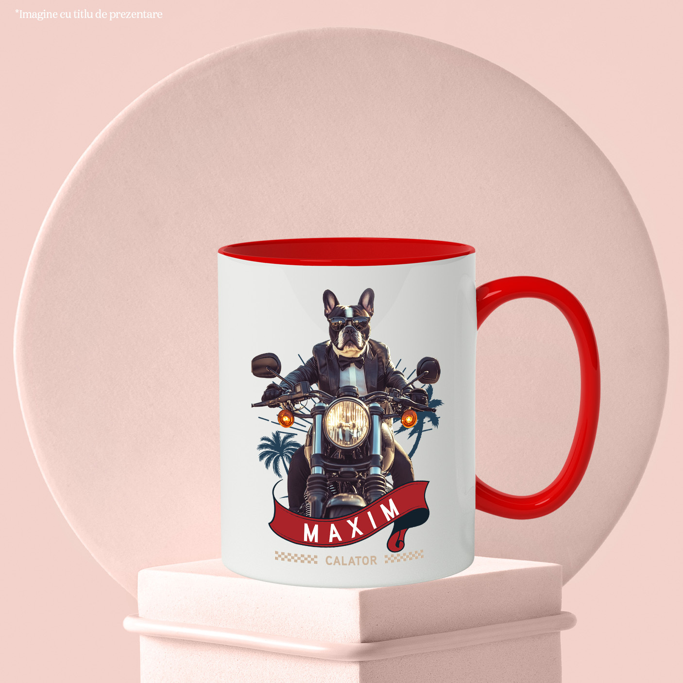 Cana cu Animal Pe Motocicleta in Costum, Peronalizata cu Numele si Poza Animalului Tau cu Maner Rosu