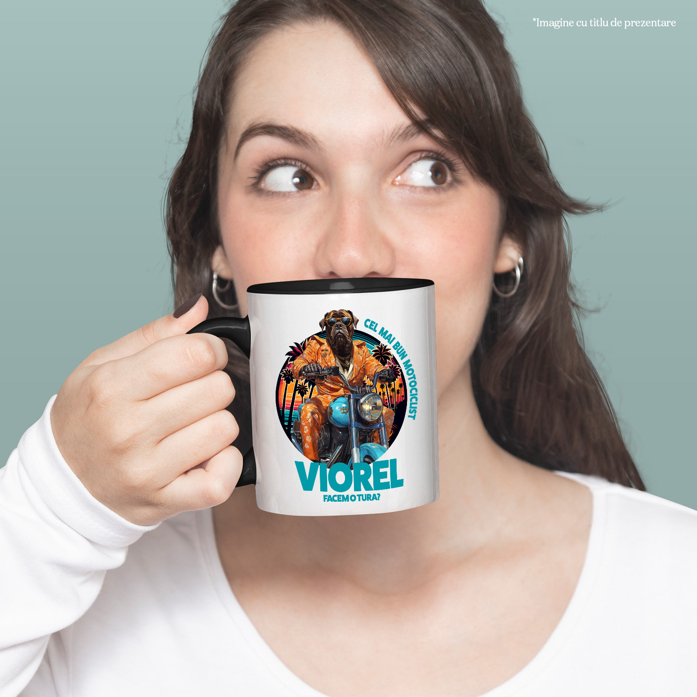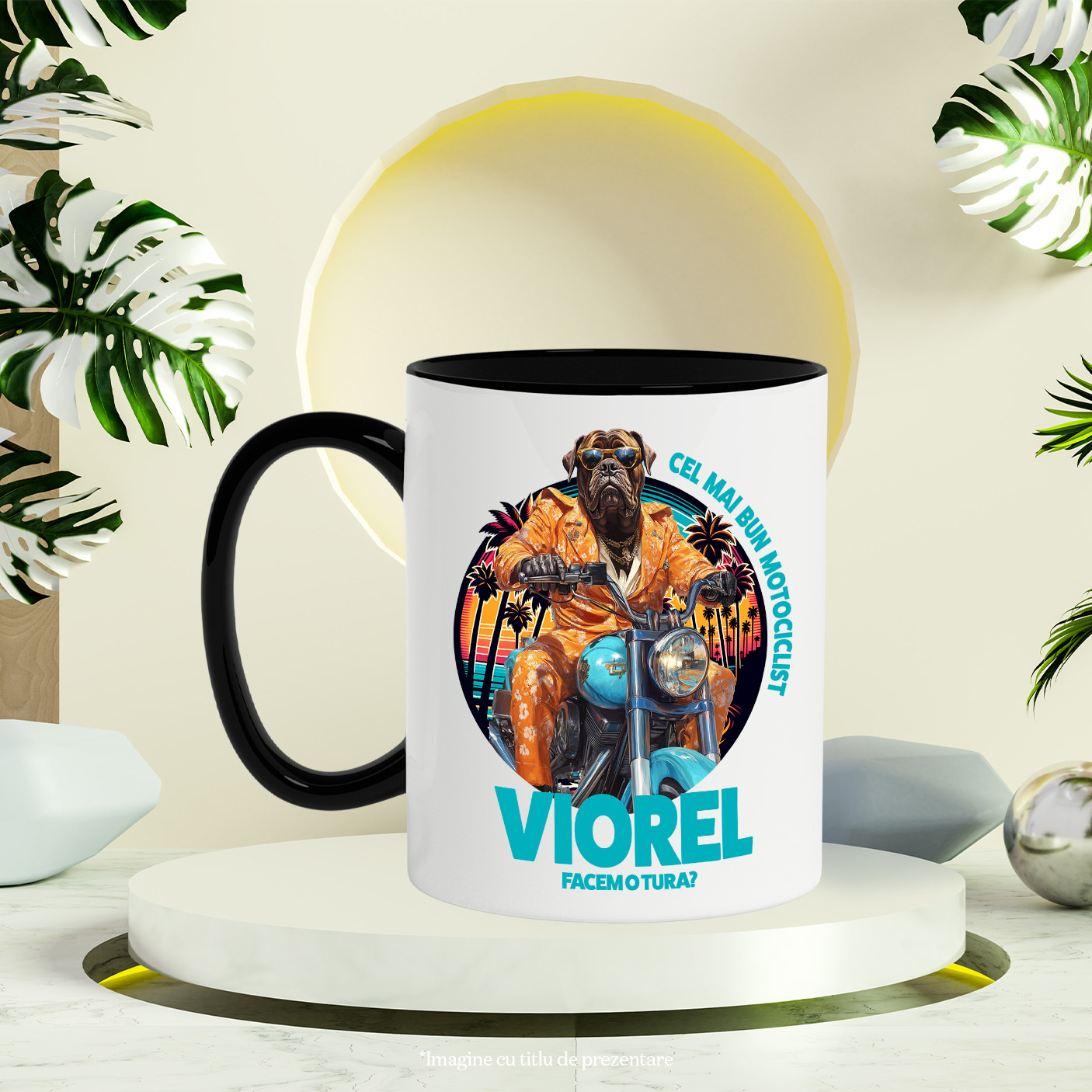 Cana cu Animal Pe Motocicleta, La Apus cu Palmieri, Peronalizata cu Numele si Poza Animalului Tau cu Maner Negru