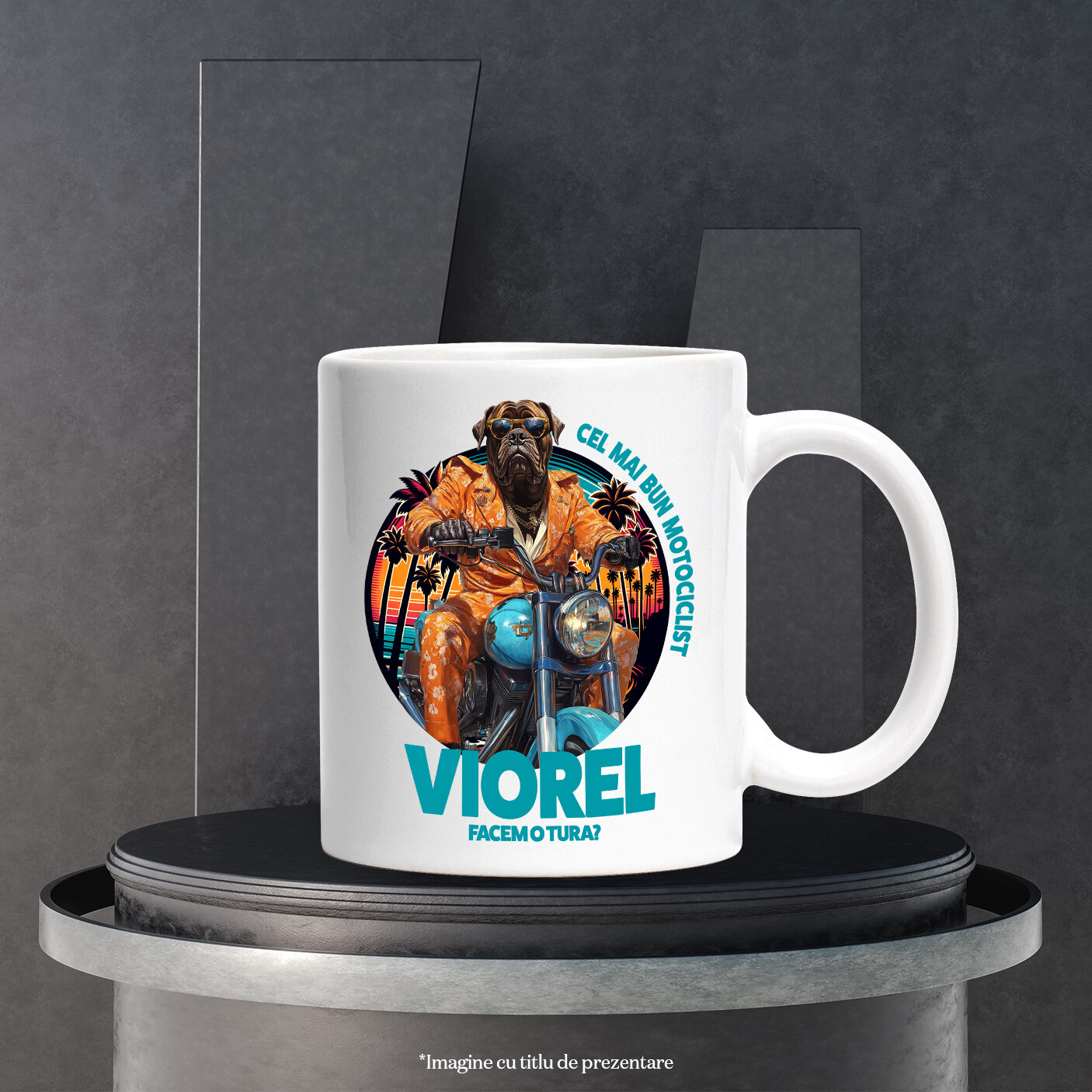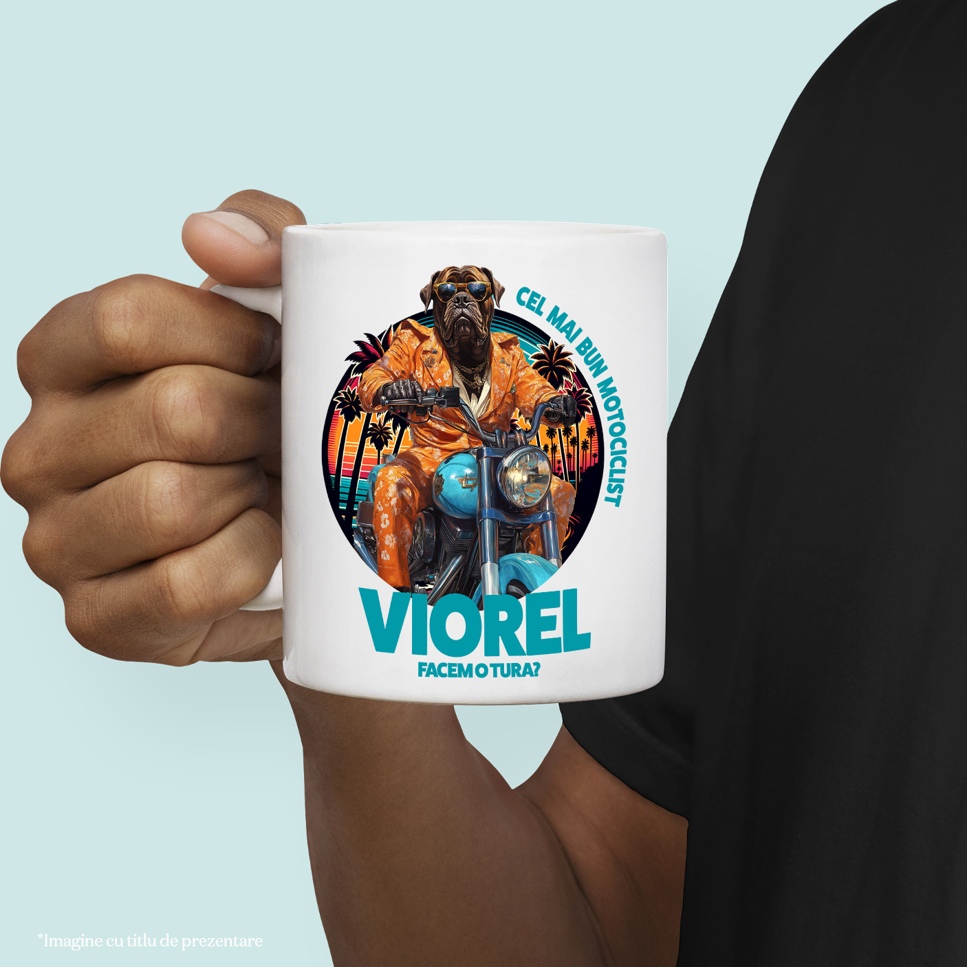 Cana cu Animal Pe Motocicleta, La Apus cu Palmieri, Peronalizata cu Numele si Poza Animalului Tau cu Maner Alb