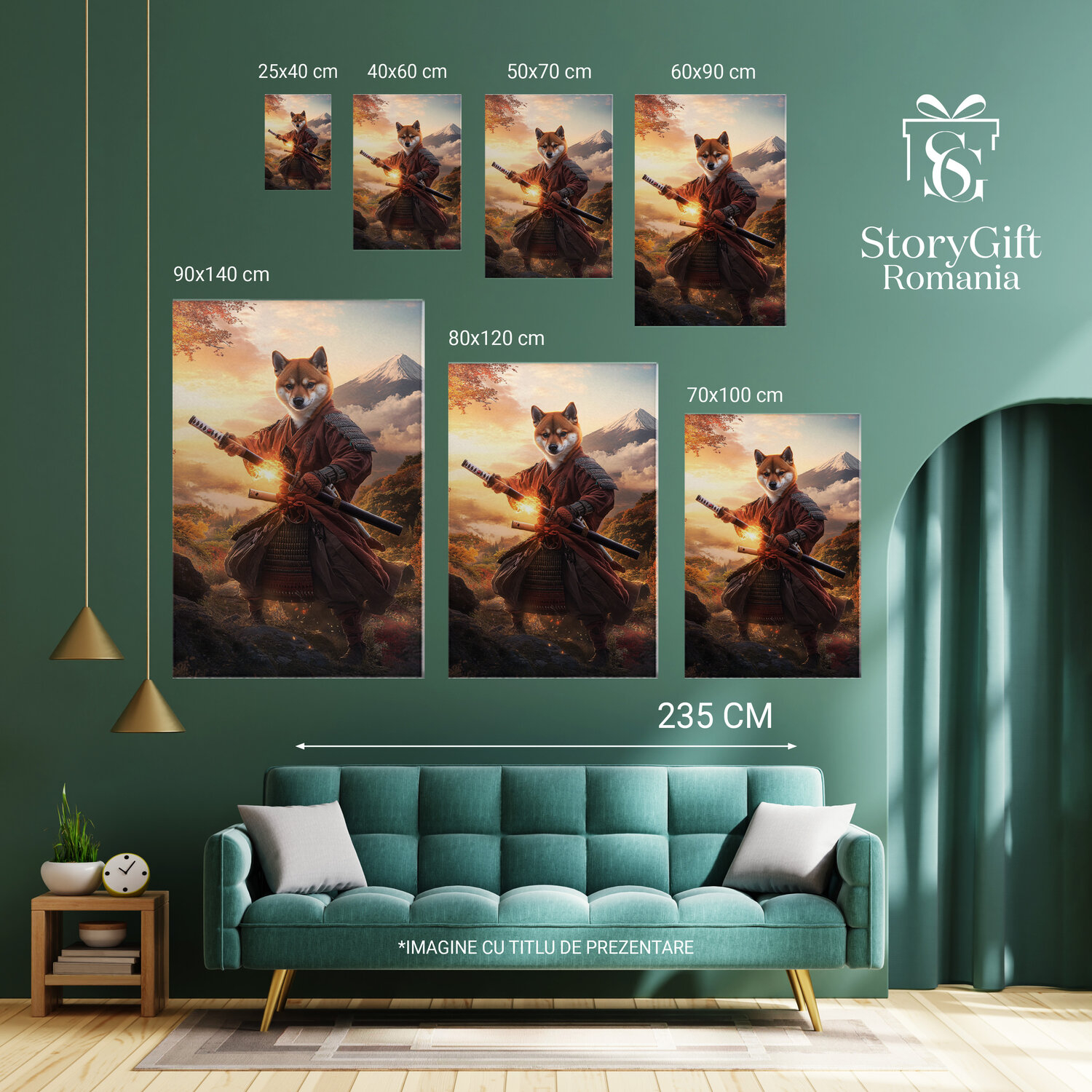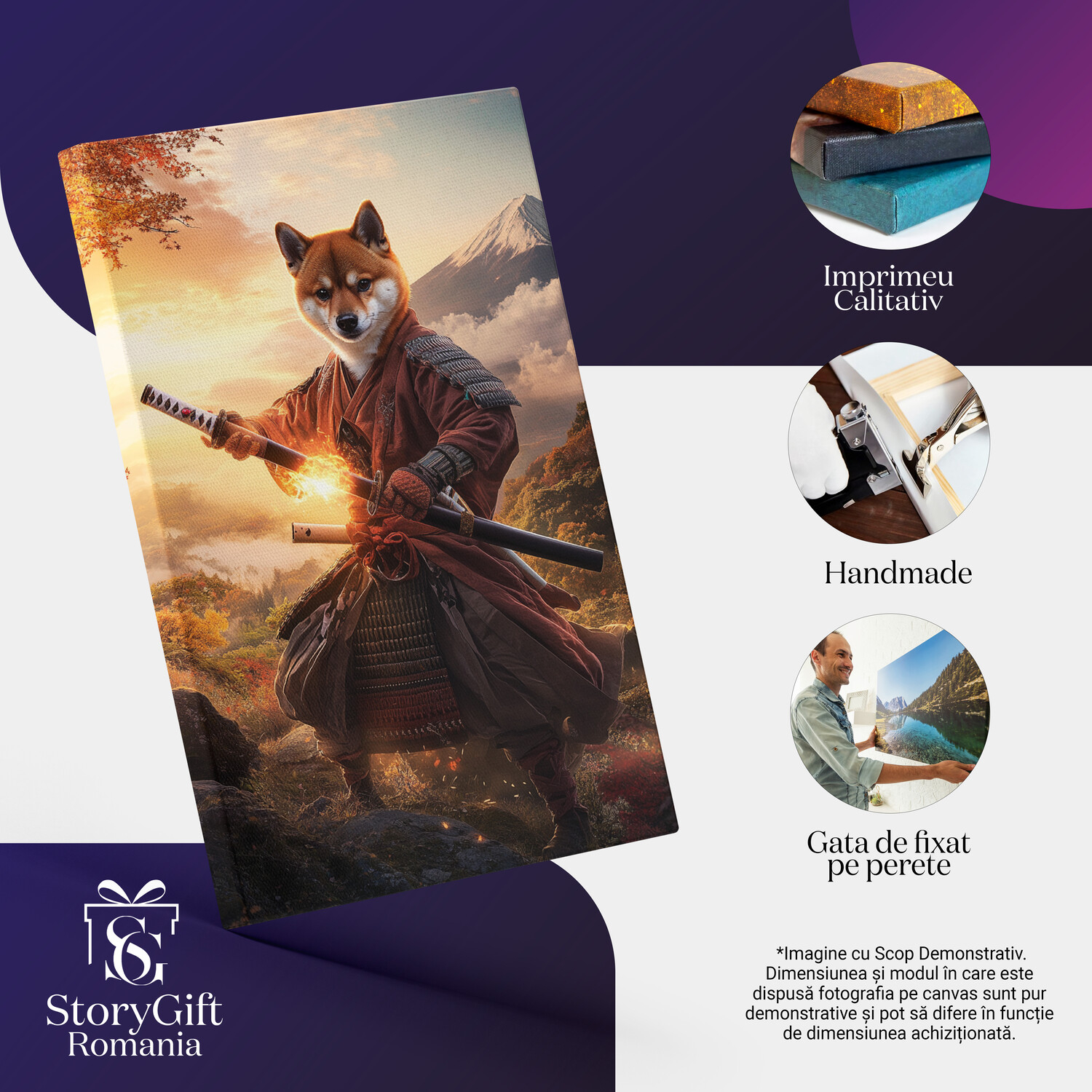 Tablou Canvas Personalizat Asasin cu tinuta traditional japoneza, cu sabii, razboinic, apus de soare, deasupra muntelui 40x25CM