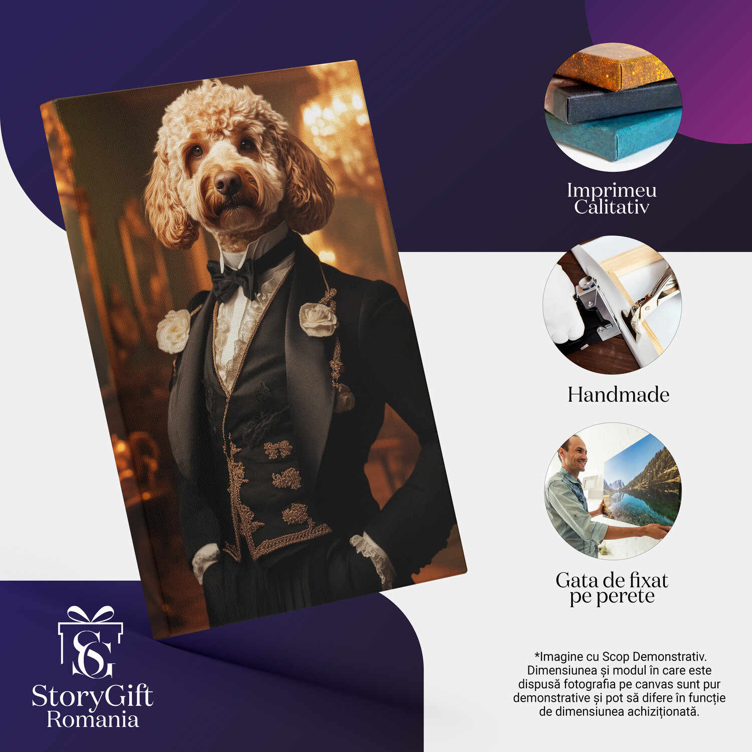Tablou Canvas Personalizat Cavaler In Palat, Tinuta Eleganta cu Jupon Negru Si Vesta Cu Detalii Auri, Papion Si Guler Inalt, Trandafiri Albi In Piept 120x80CM