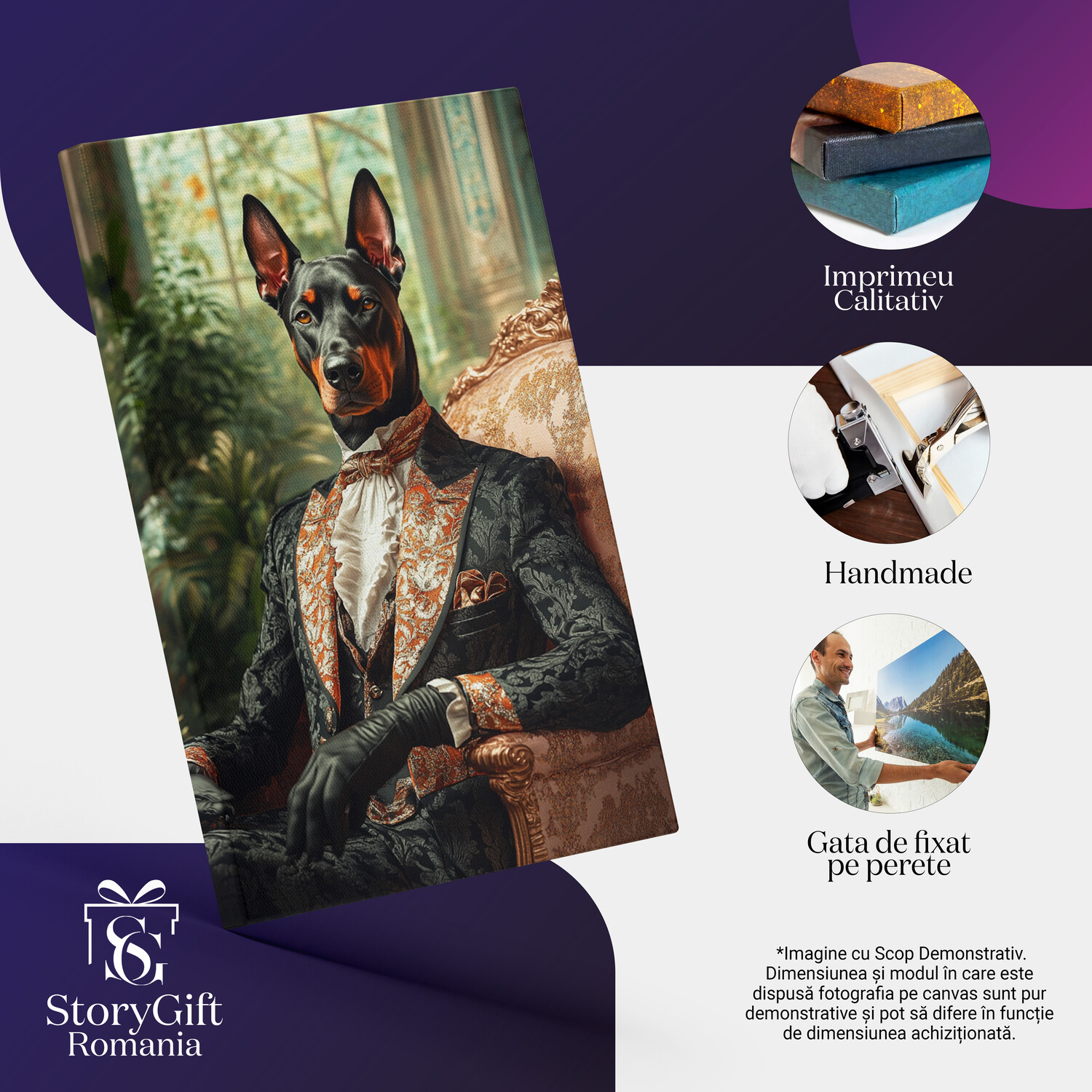 Tablou Canvas Personalizat Conte pe fotoliu regal in tinuta neagra eleganta cu detalii rosii, manusi de piele, camasa alba cu funda 90x60CM