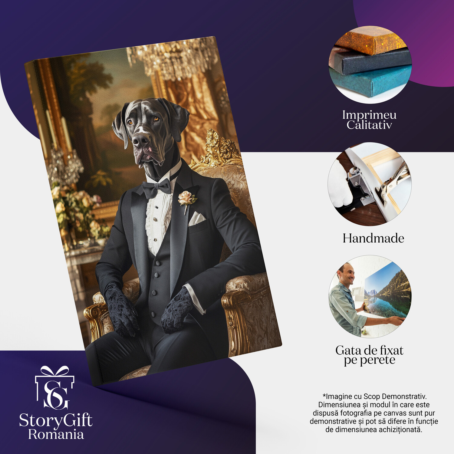 Tablou Canvas Personalizat Conte pe tron de aur in tinuta eleganta costum negru clasic cu camasa si papion, trandafir roz in piept , manusi de dantela 140x90CM
