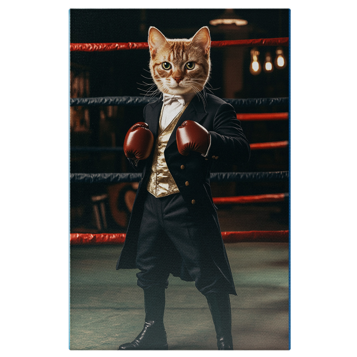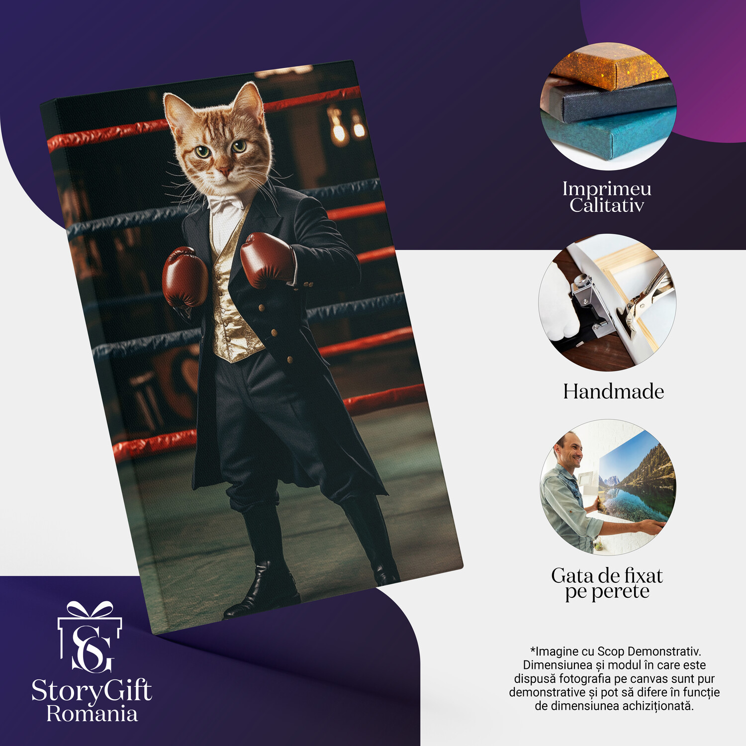 Tablou Canvas Personalizat Conte regal cu manusi de box rosii in ring, tinuta regala, palton negru cu detalii aurii, camasa alba cu funda 40x25CM