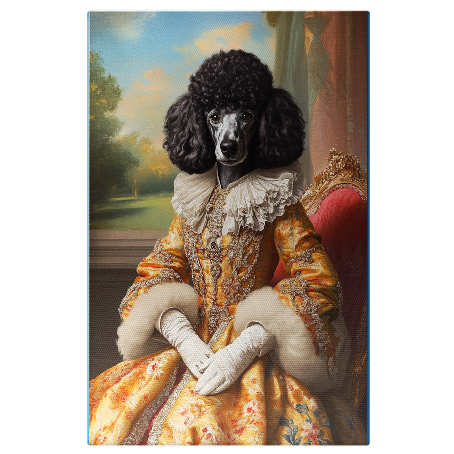 Tablou Canvas Personalizat Contesa regala cu rochie galbena cu detalii din blana, dantela, fotoliu rosu 140x90CM