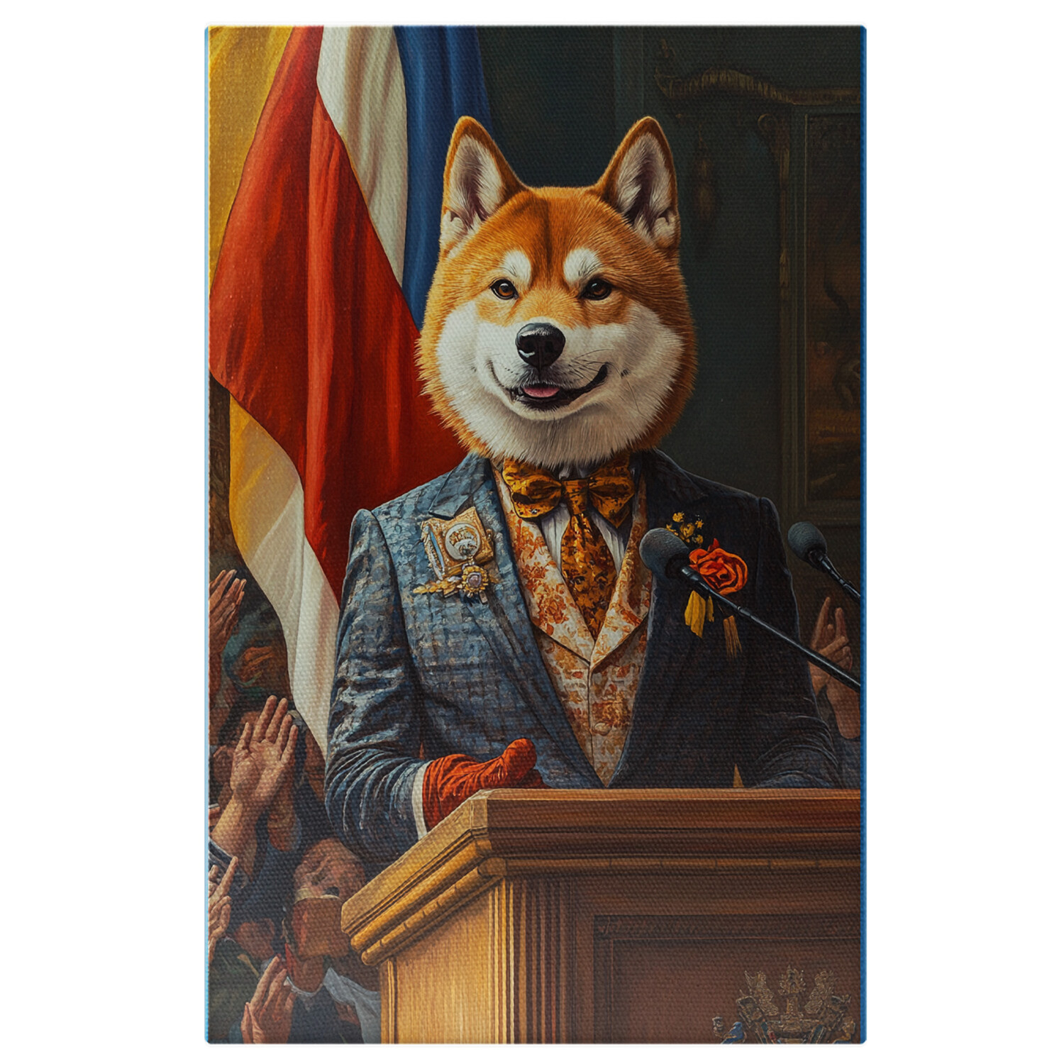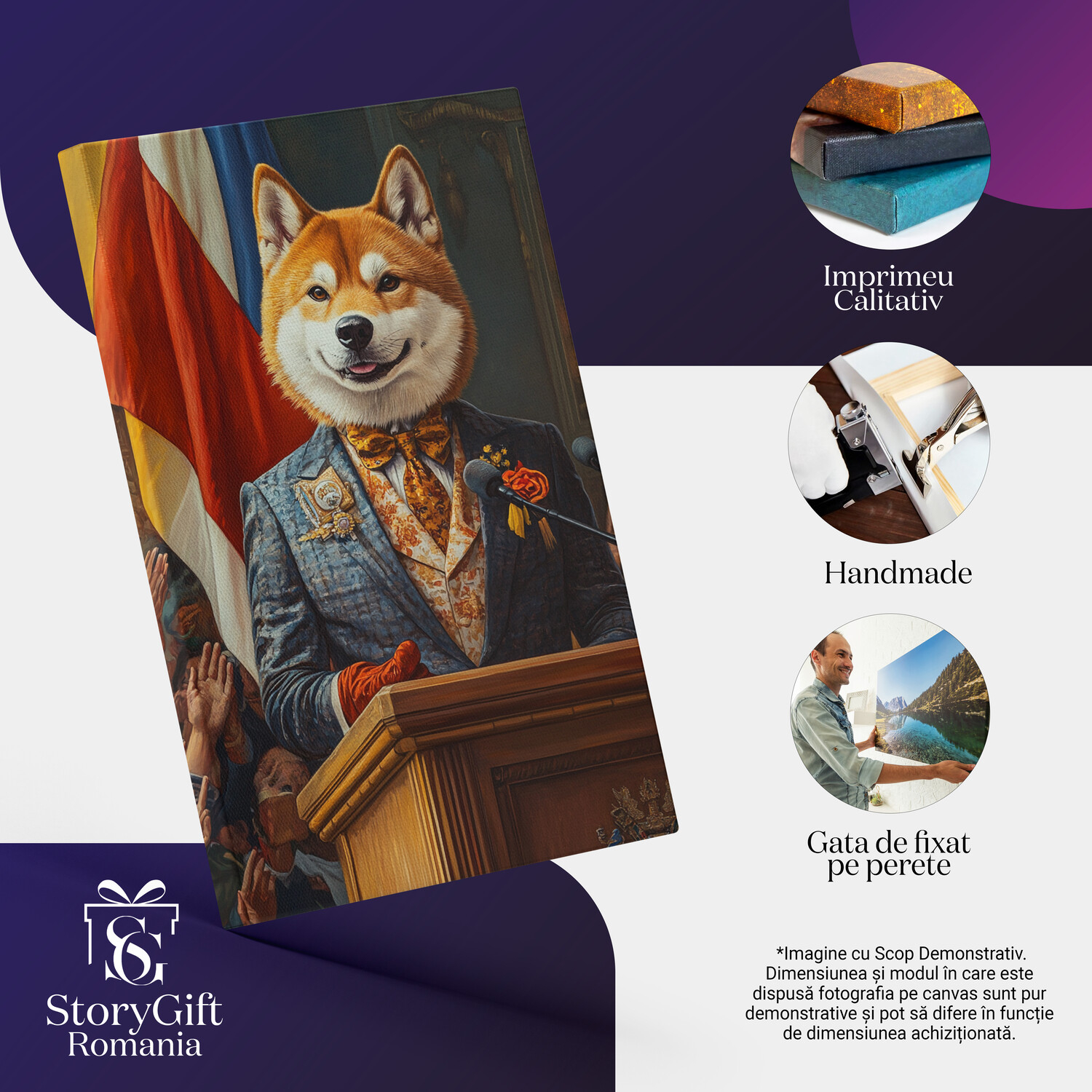 Tablou Canvas Personalizat Discurs Prezidential, Sef De Stat In Tinuta Eleganta Still Aristrocrat cu Sacou Albastru Si Cravata Stil Funda Portocalie 120x80CM