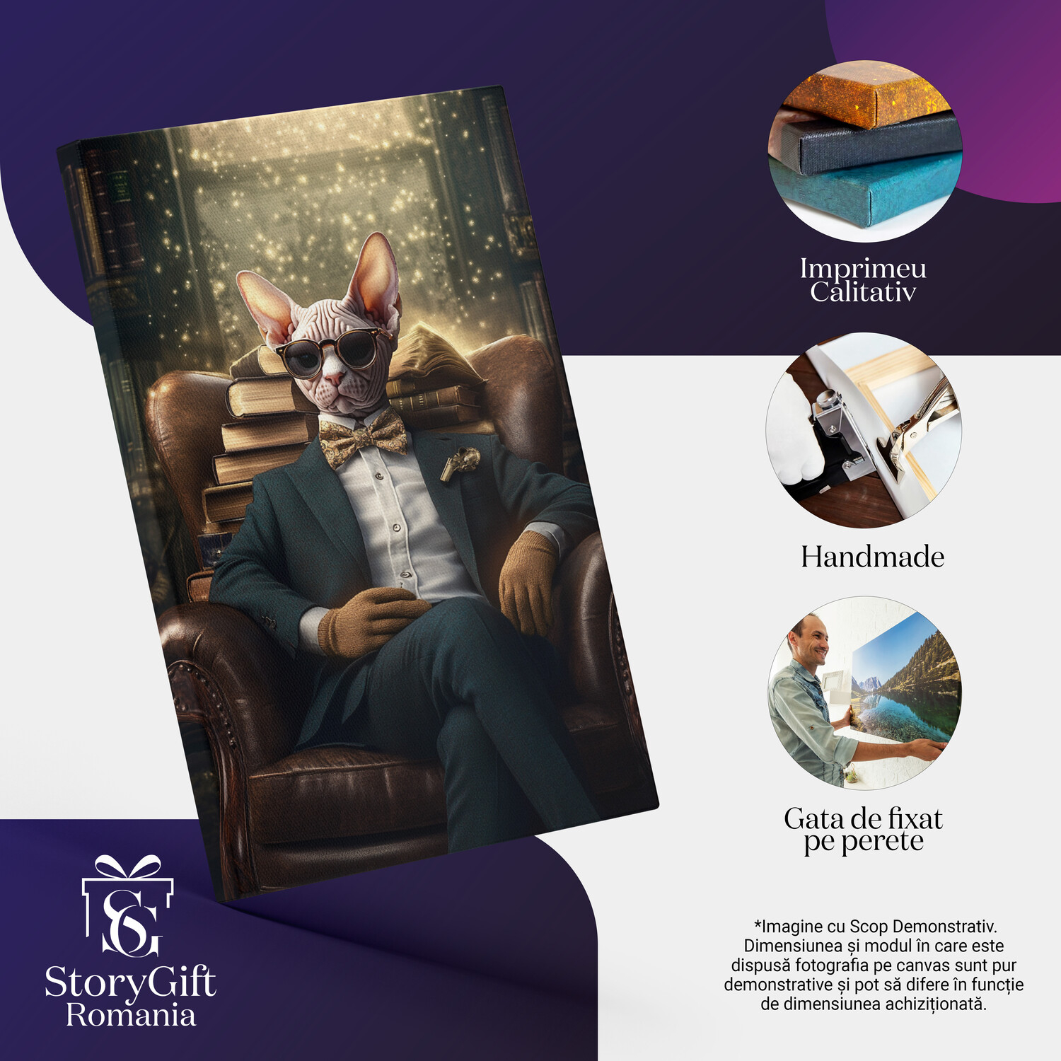 Tablou Canvas Personalizat Mafiot pe Fotoliu cu teanc de carti, tinuta eleganta cu papion galben, costum albastru si manusi de lana portocalii 40x25CM